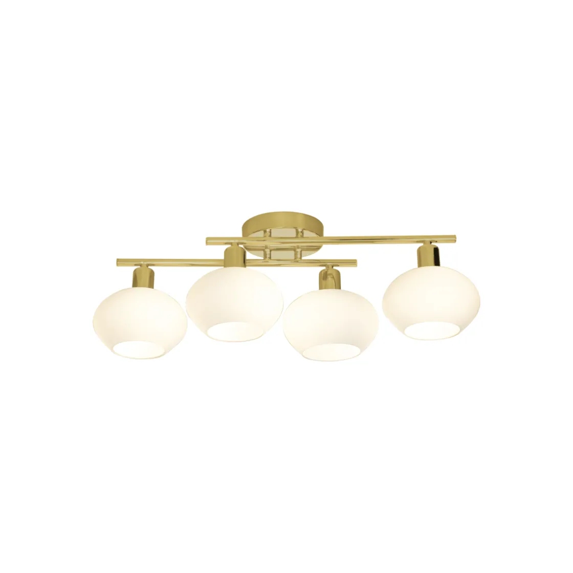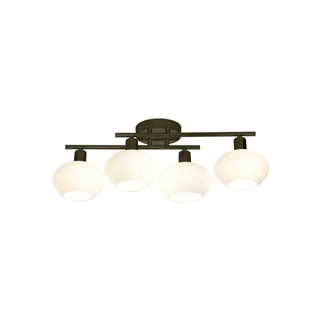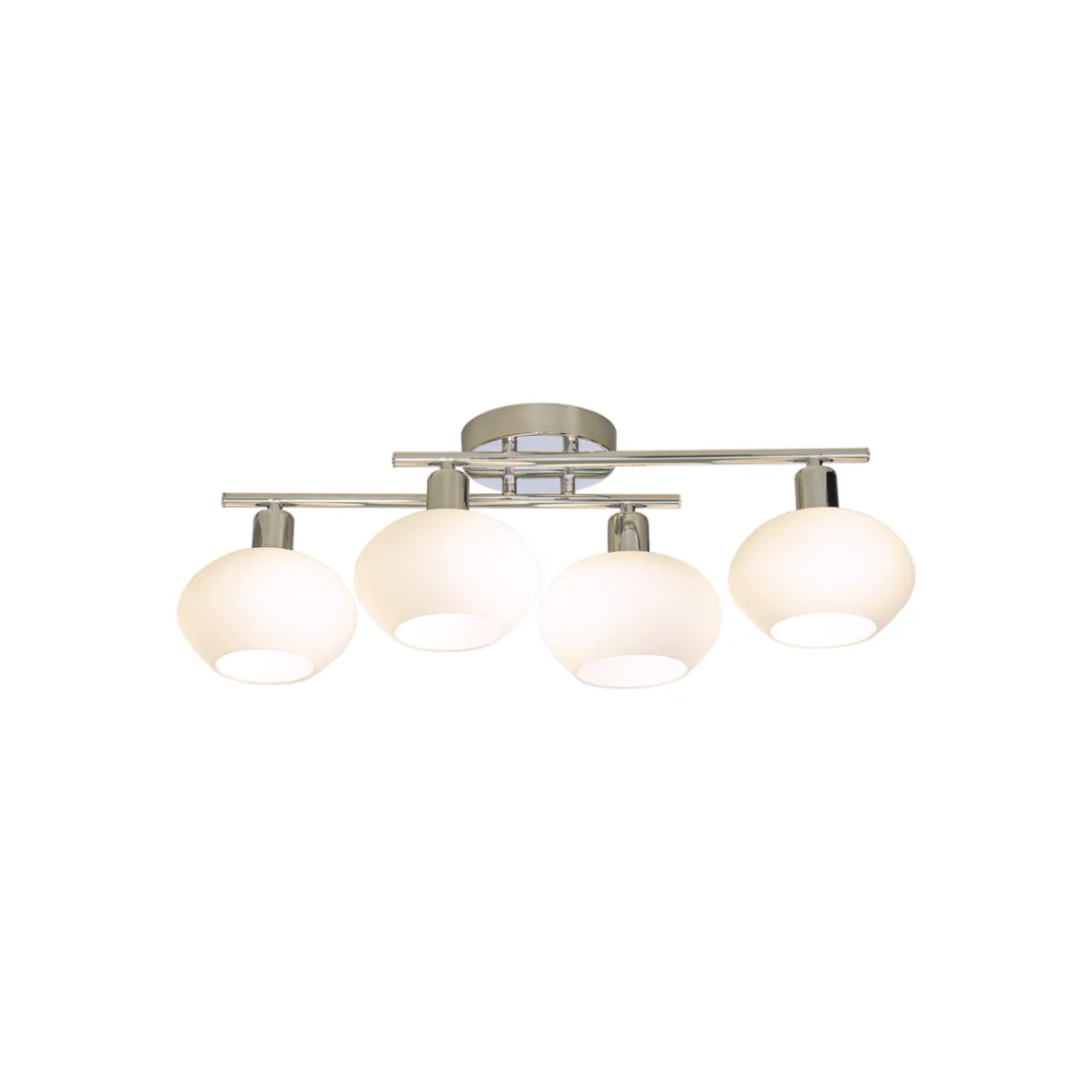 Denne taklampen er laget av forkrommet metall og har et elegant design med fire opalhvite glasskupler som skaper et mykt og behagelig lys.