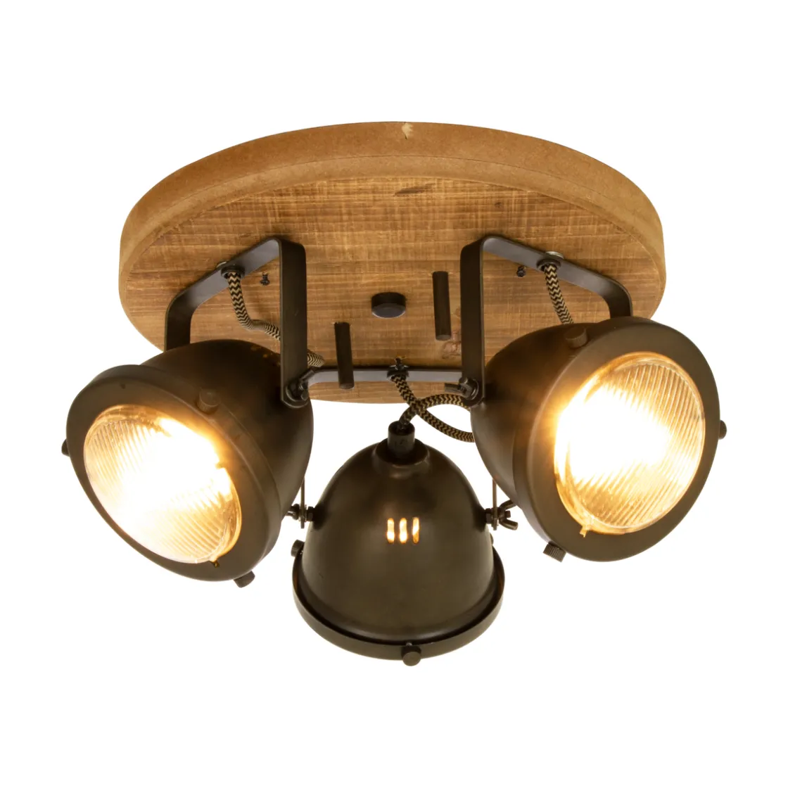 Alaska takspot i rustikk stil med jerngrå lampeskjerm i metall og detaljer i tre. Lampen henges opp på krok i taket og spothodene kan justeres i ønsket retning for stemningsfullt lys i rommet.