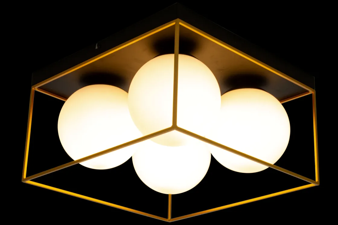 Astro taklampe med 4 opalhvite glasskupler innrammet i gulldetaljer på svart takplate. Lampens hovedmateriale er metall/glass. Wattstyrke maks 4 x 25W. Lyspærer ikke inkludert. Lampen monteres på bøyleoppheng/brakett og tilkobles med koblingsklemme.