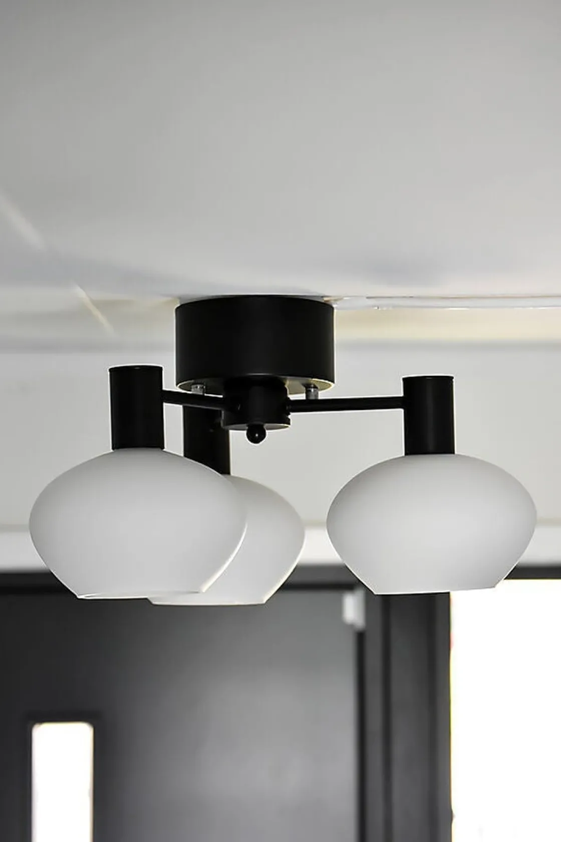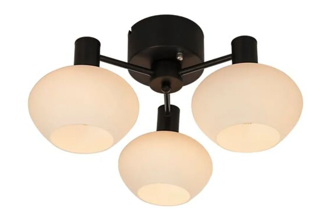 Bell plafond i svart med 3 opalhvite glass på fastmonterte armer. Lampens hovedmateriale er metall og glass. Max wattstyrke er 30W pr. lyskilde. Lyspærer følger ikke med. Plafonden monteres i taket på krok og kobles til strøm med koblingsklemme.