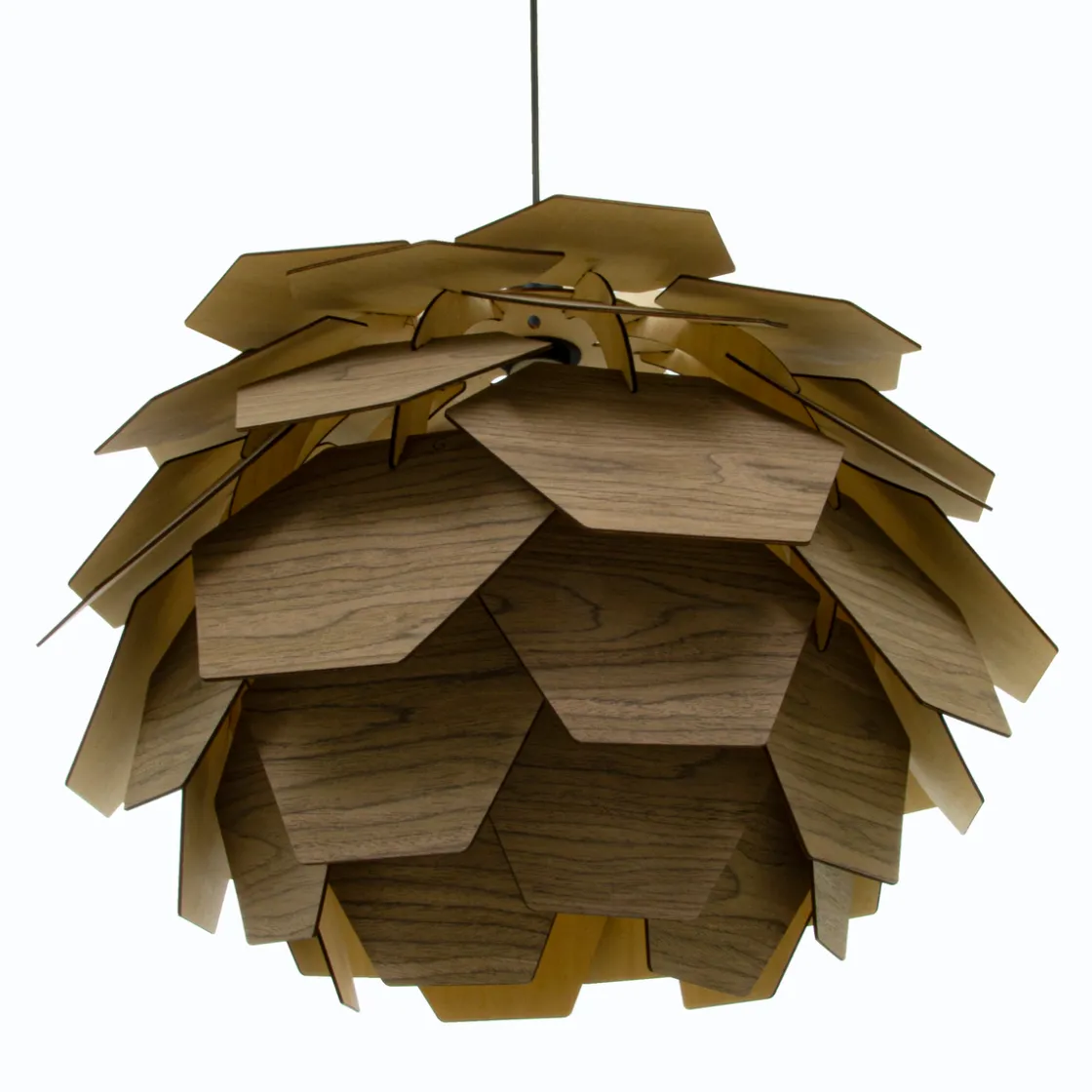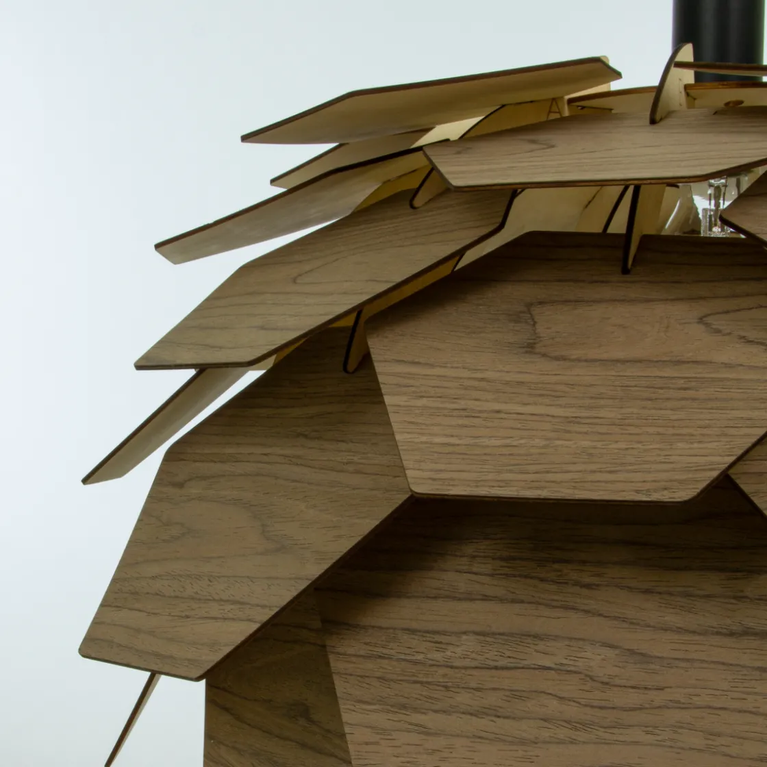Vakre Carpatica taklampe har flere lag treplater med brunt finer og har et design som minner om en rund kjegle. Lampen gir et dempet, veldig behagelig lys som er perfekt i stuen eller over spisebordet. Carpatica leveres i flat pakke, du setter sammen lampen selv i noen få enkle steg. Svart takkopp med krokoppheng.