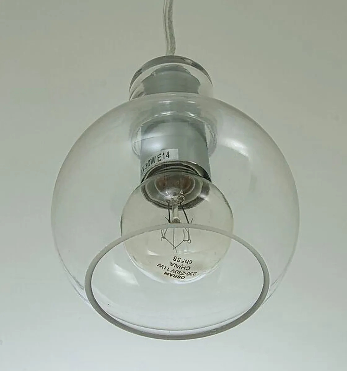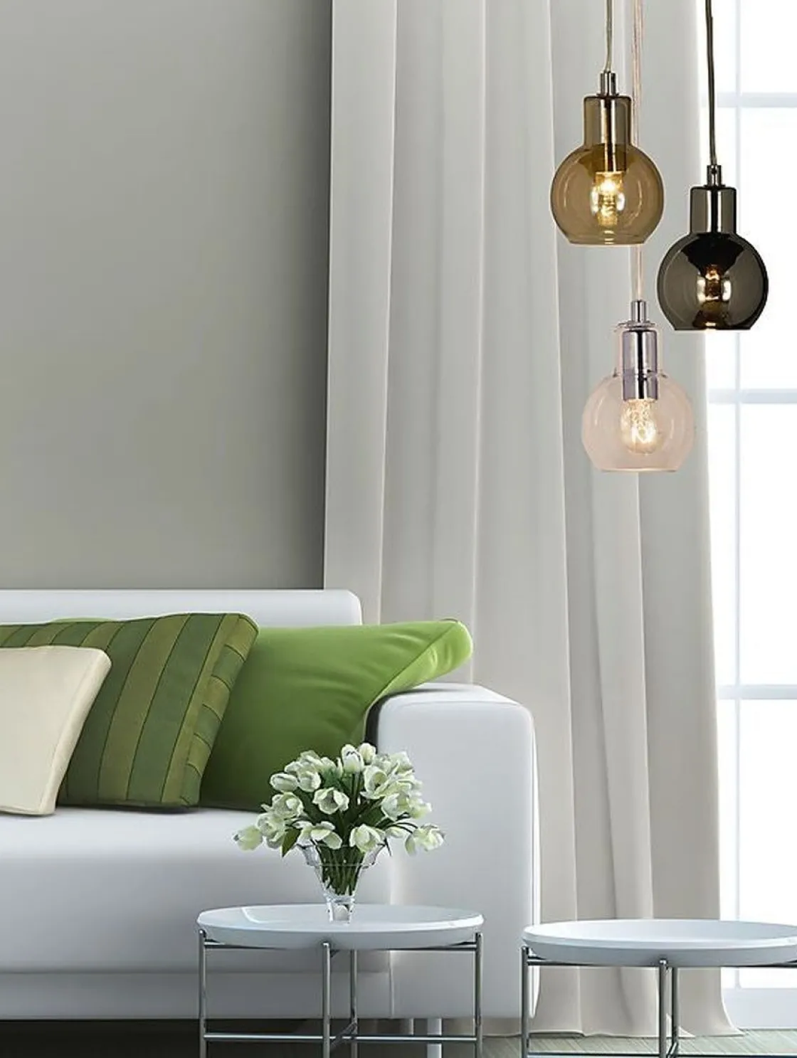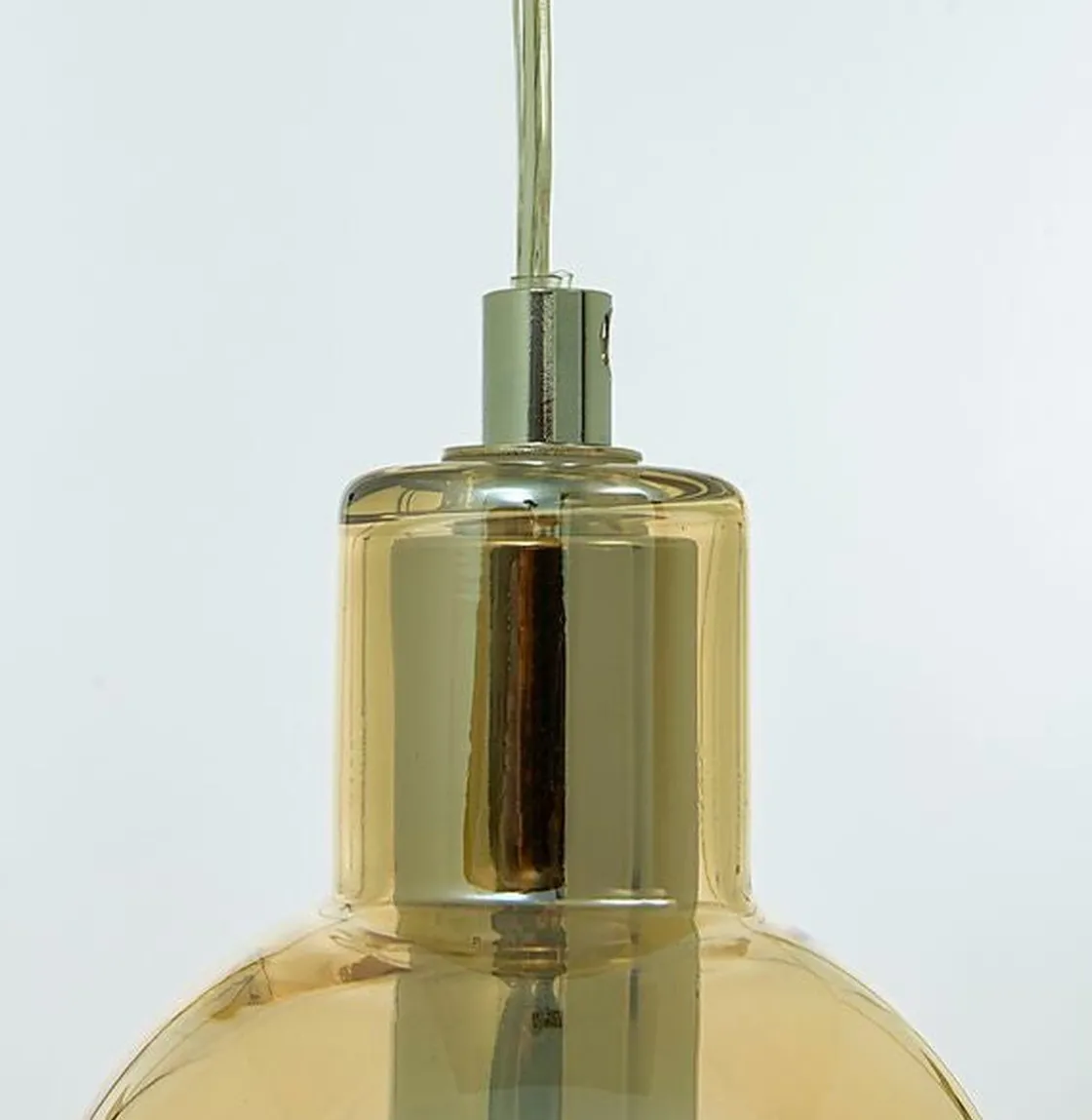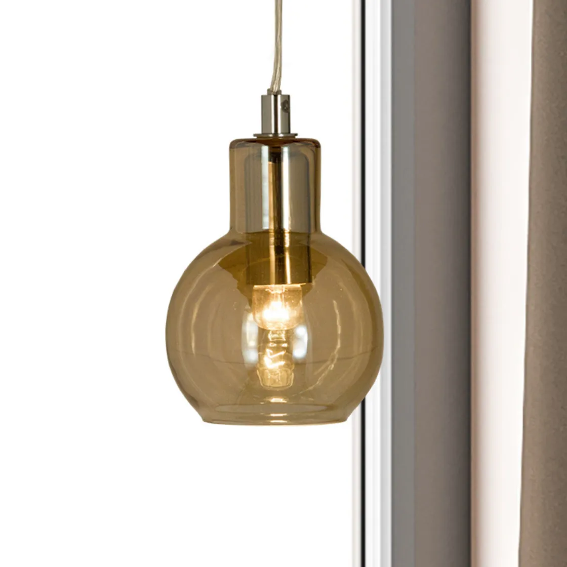 Leah vinduspendel i krom med glasspendel i fargen røk. Lampens hovedmateriale er metall/glass. Lyset tennes og slukkes med bryter på ledning. Ledning 4 meter. Maks wattstyrke 30W. Lampe monteres med brakett på ledning og strømtilkobling med støpsel.