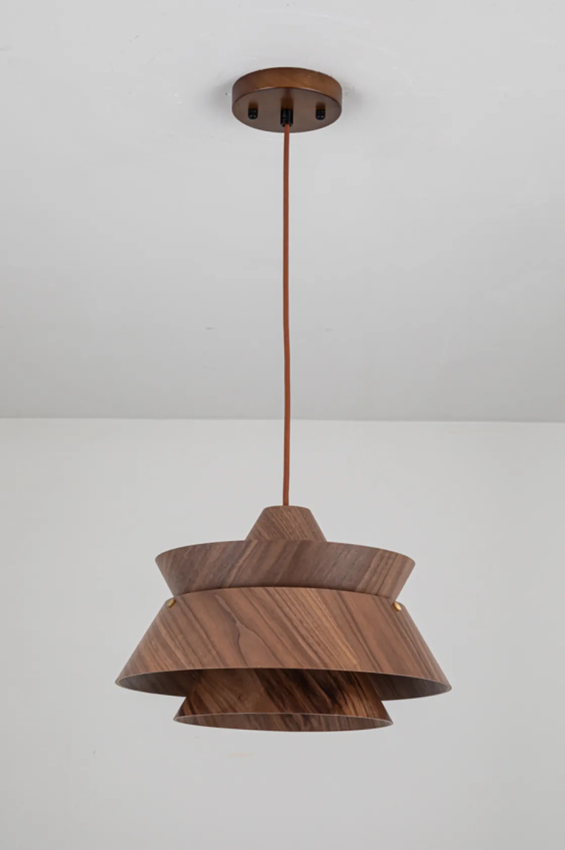 Pendelen er laget av valnøtt, et eksklusivt og mørkt tre med en varm, naturlig glød. De fine kornene i treverket gjør hver lampe unik og understreker håndverkskvaliteten.