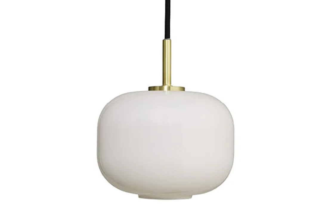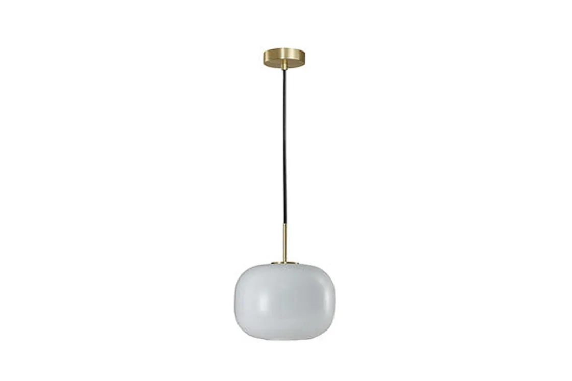 Det melkehvite skinnende glasset er håndblåst i håndverkskvalitet – samtidig som det er moderne i smaken. Alt i alt er lampen produsert i en kombinasjon av materialer, hvor glass, metall og stofftråd spiller sammen og forbinder hverandre i en estetisk delikat helhet.
