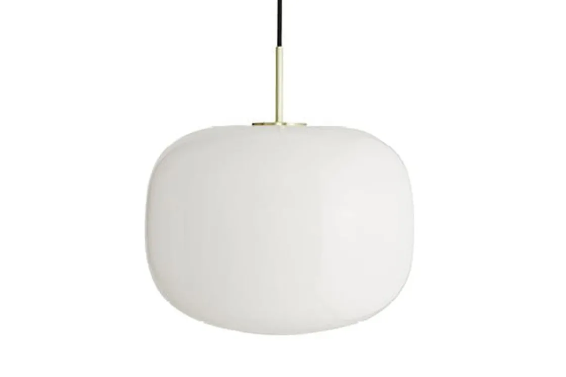 Det melkehvite skinnende glasset er håndblåst i håndverkskvalitet – samtidig som det er moderne i smaken. Alt i alt er lampen produsert i en kombinasjon av materialer, hvor glass, metall og stofftråd spiller sammen og forbinder hverandre i en estetisk delikat helhet.