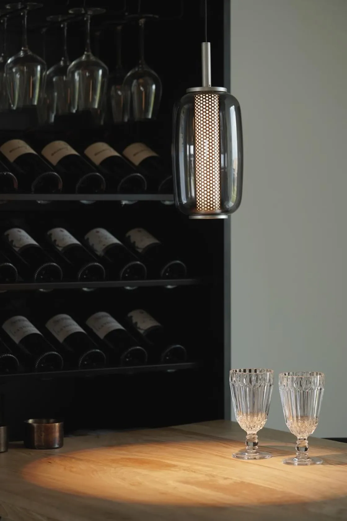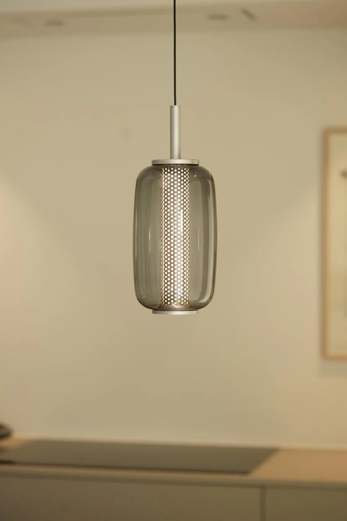 Midnight har et særegent design med kontrasten mellom det mørke glasset og den indre skjermen, noe som gir både funksjonalitet og finesse. Den integrerte LED-modulen skinner både gjennom glasset og rett nedover, noe som gjør pendelen egnet for både funksjonell og dekorativ belysning.