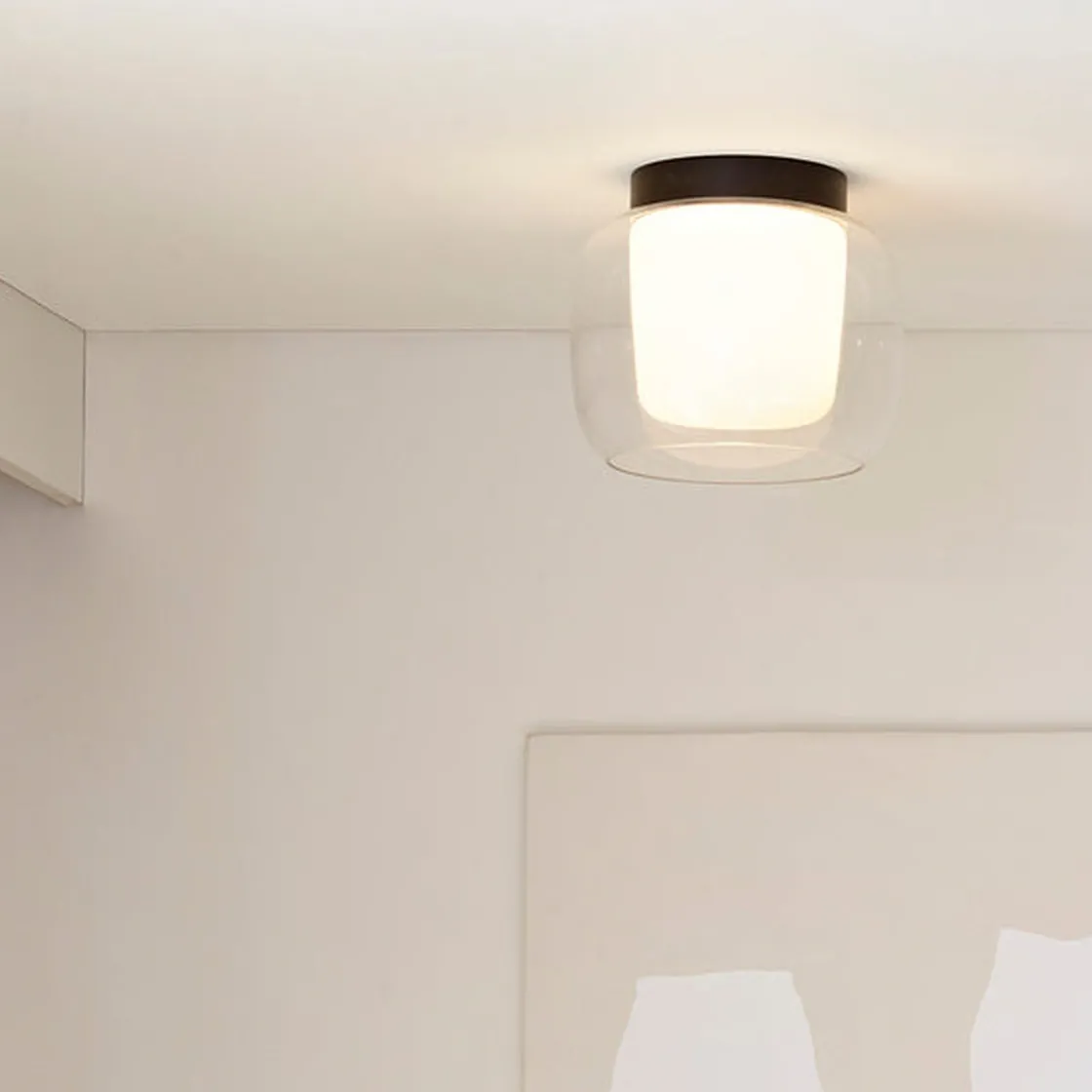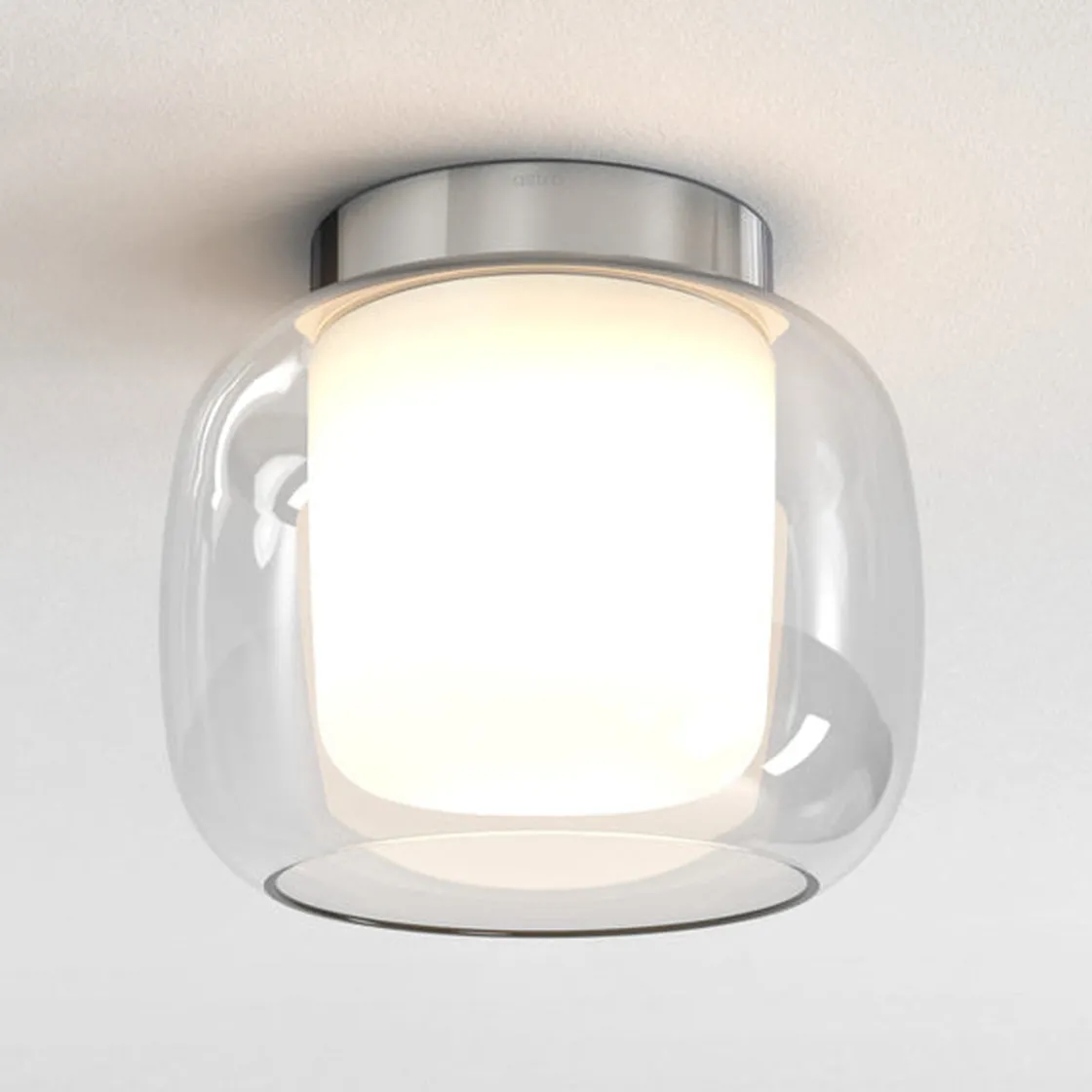 Med sine organiske kurver inspirert av elliptiske former, myker taklampen Aquina et baderomsutseende og gir atmosfærisk arbeidsbelysning når den brukes som hovedlyskilde. Den utskiftbare doble glassskjermen er sikret med design og har ingen synlige fester for en sømløs finish.