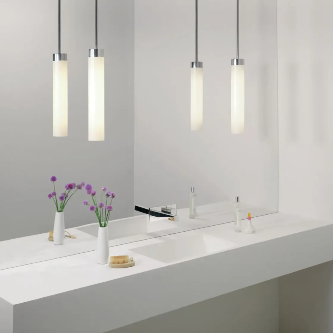 Denne stilrene pendellampen kombinerer et tidløst design med moderne funksjonalitet. Den elegante kombinasjonen av blank krom og opalhvitt glass gir et mykt og behagelig lys som passer perfekt over spisebordet, kjøkkenøya eller i stuen.