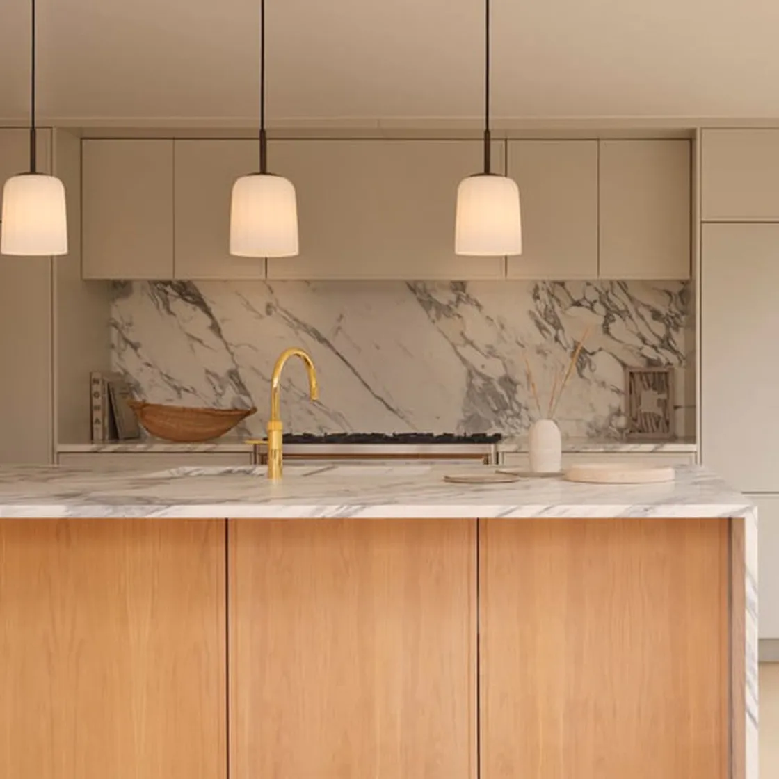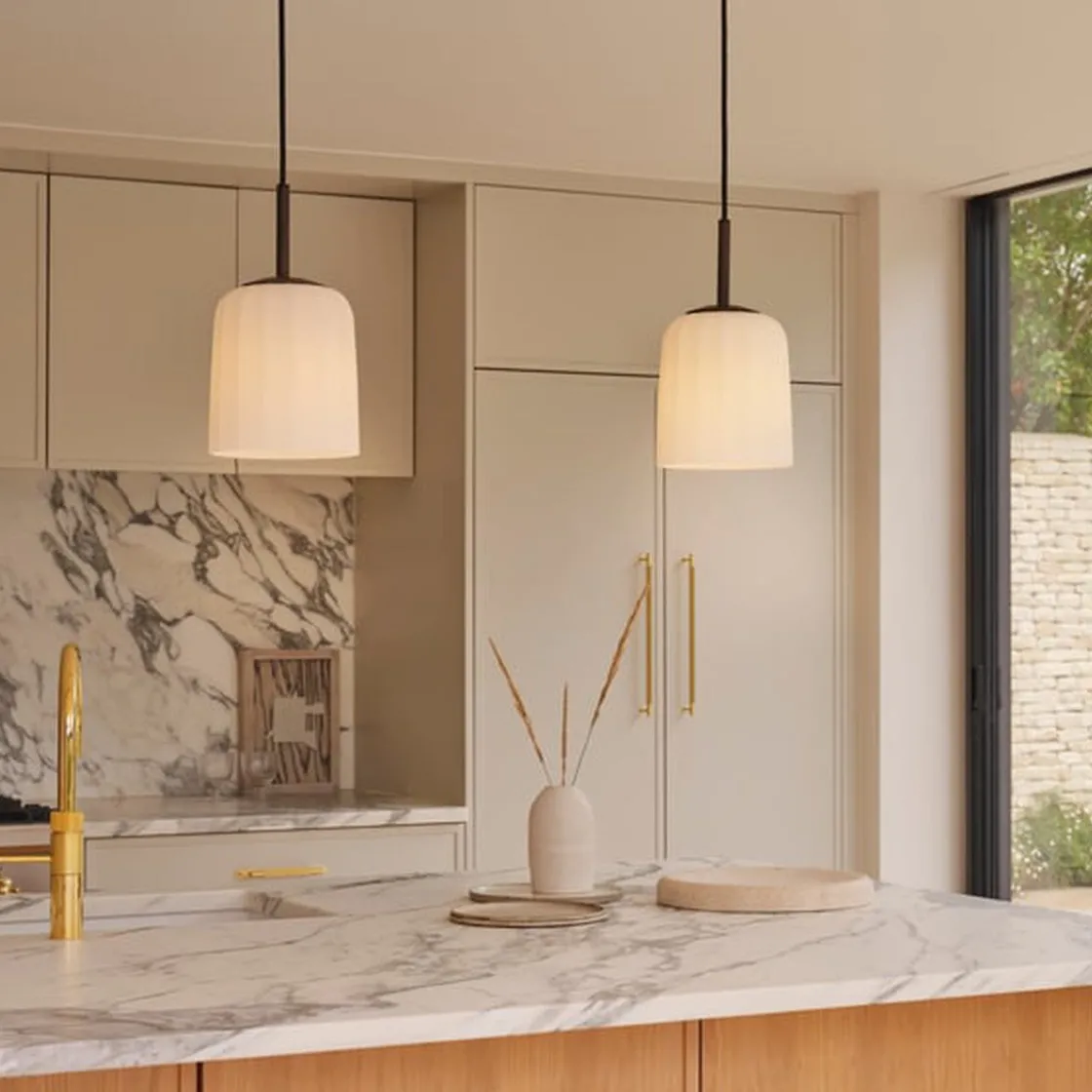 Veo 230 er en innendørs takpendel med en håndblåst dupleksglassskjerm, og har intrikate riflede detaljer inspirert av søylene i klassisk gresk arkitektur. Glassskjermen sprer en varm, omgivende glød som gir tidløs eleganse til ethvert rom.