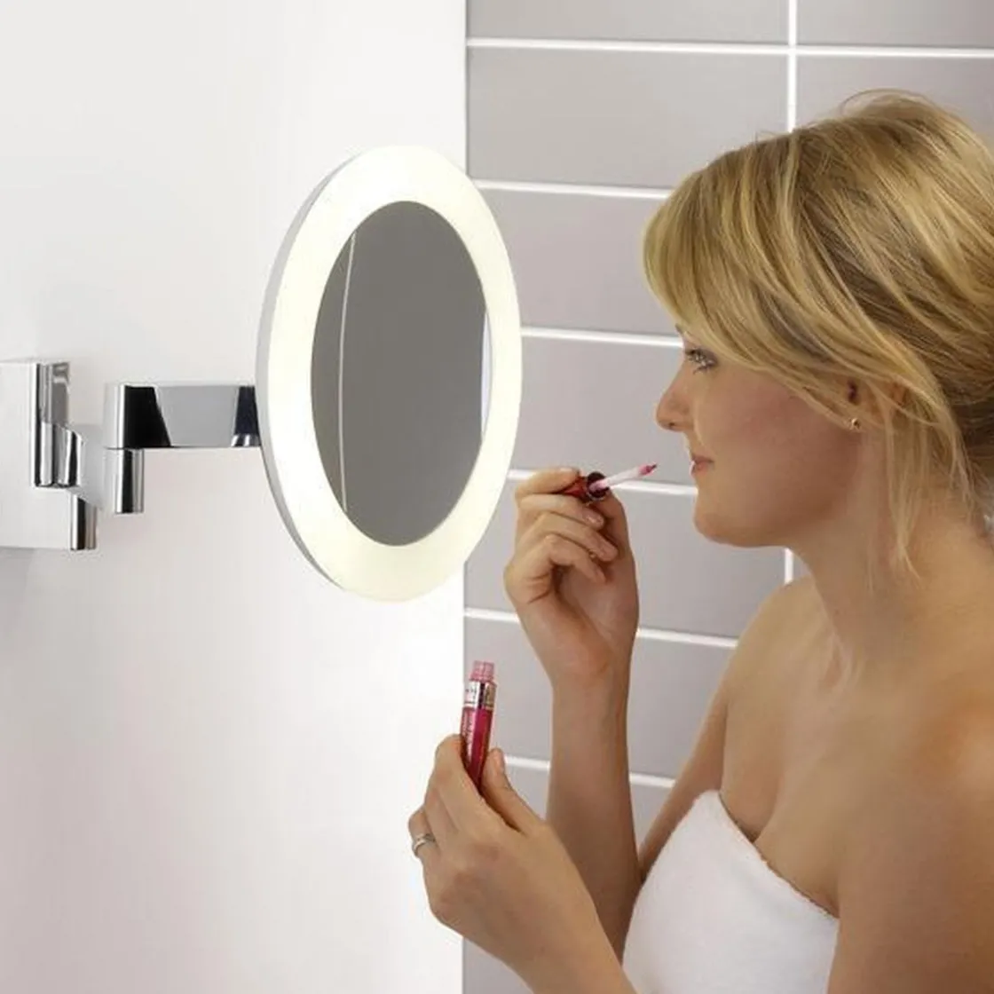 Nimi-rundt speil med lys i polert krom med sandblåst detaljer.