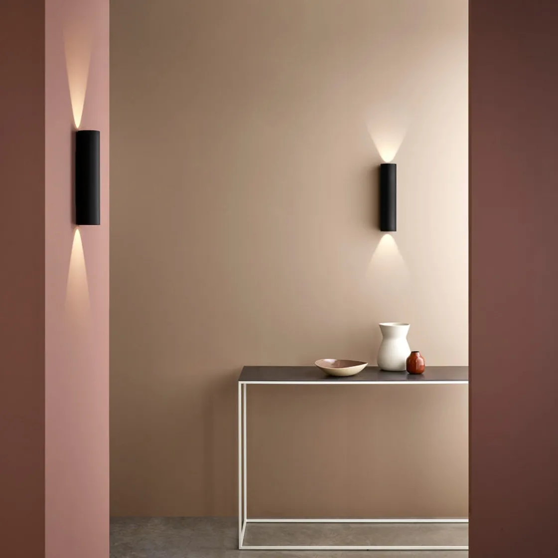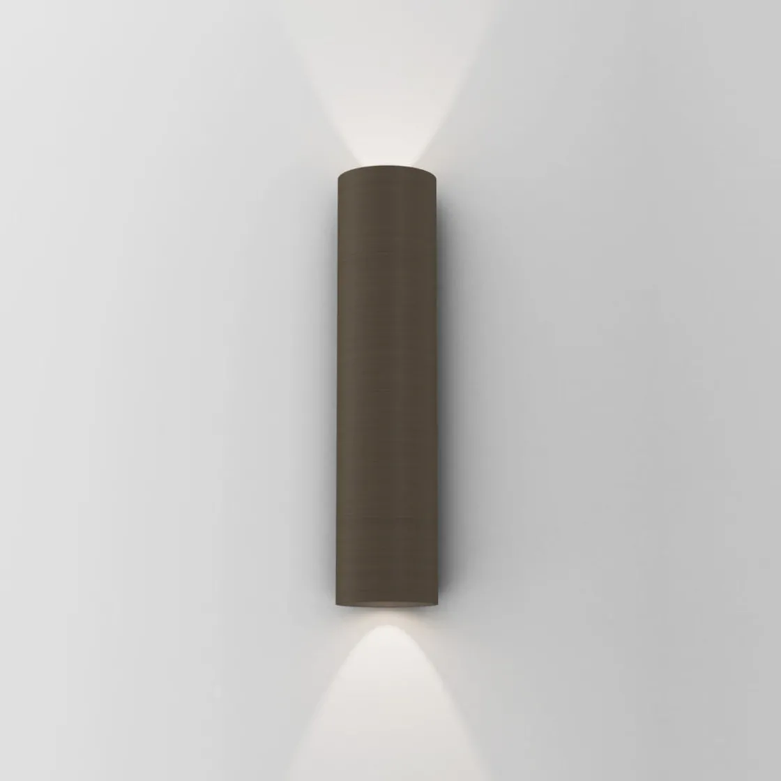 Vegglampen Yuma 300 er en moderne fasettert form inspirert av nyklassisk arkitektur. Den vasker definerte lysboller oppover og nedover, og kaster komplekse skygger som gjenspeiler formen. Den kommer i svart, bronse eller hvit og har ingen synlige fester for et sømløst utseende.