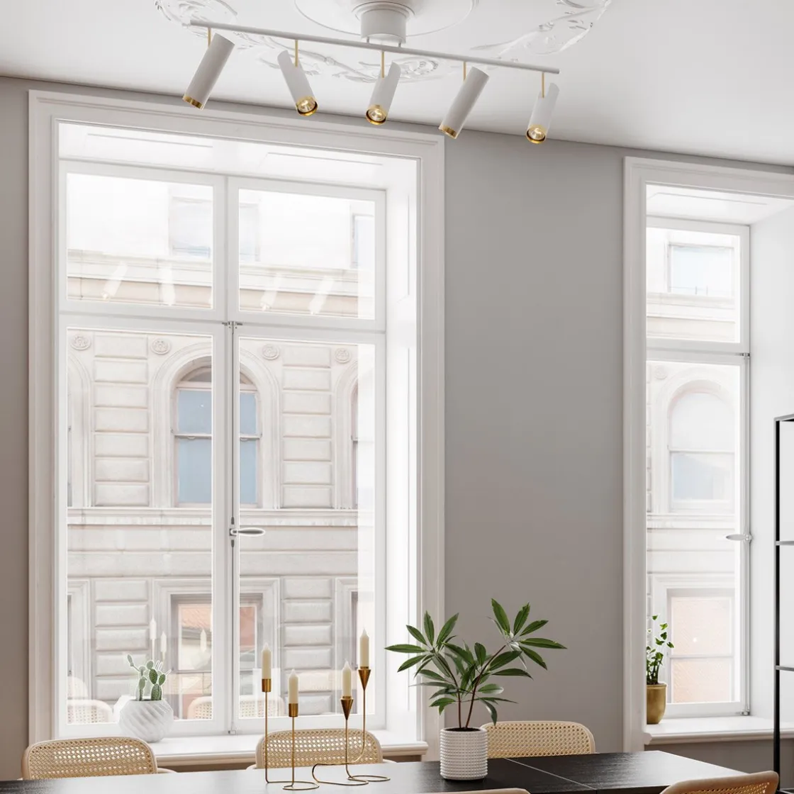 Fyll rommet med lys fra gulv til tak – Puls takskinne med fem spoter kan justeres i den retningen du ønsker. Skinnens design er enkel, men med en stor eleganse i moderne utførelse. Skinnen fås i matt hvit farge med fester av gullfarget metall som også går igjen på den ytterste delen av lampehodet. Festet er lett å montere opp i taket. La lampen sitte i taket i kjøkkenet, i entreen eller la den ta plass midt i stuetaket. Skinnen er 35 cm høy, 13 cm dyp og 110 cm bred.
