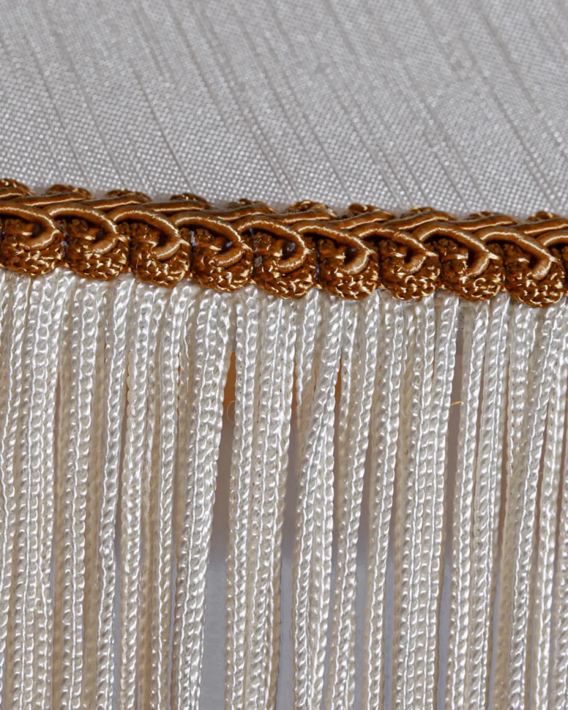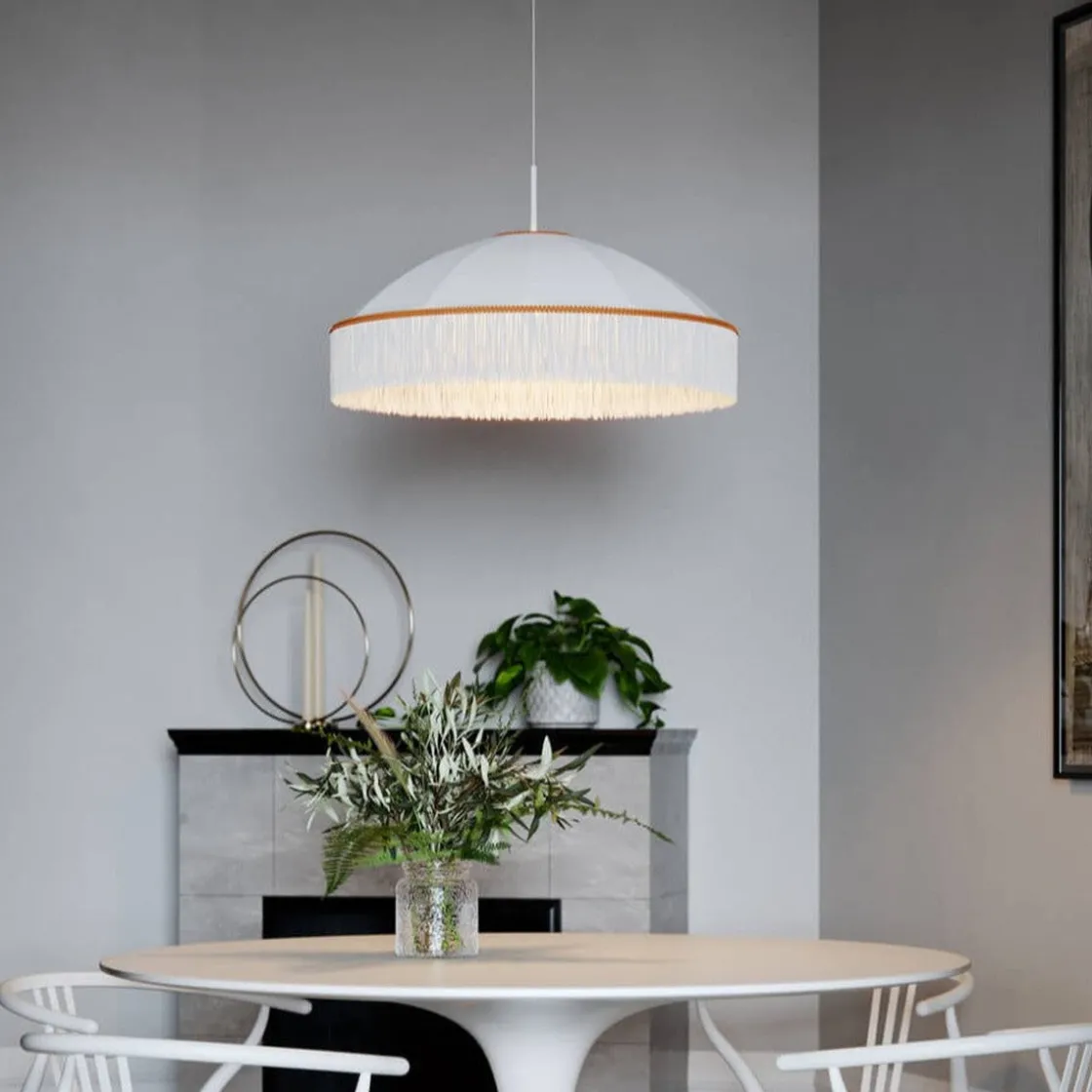 Taklampen Francis fra By Rydéns kombinerer eleganse og modernitet. Skyggen, laget av silke, er utsmykket med hengende frynser og en vakker gullkant.