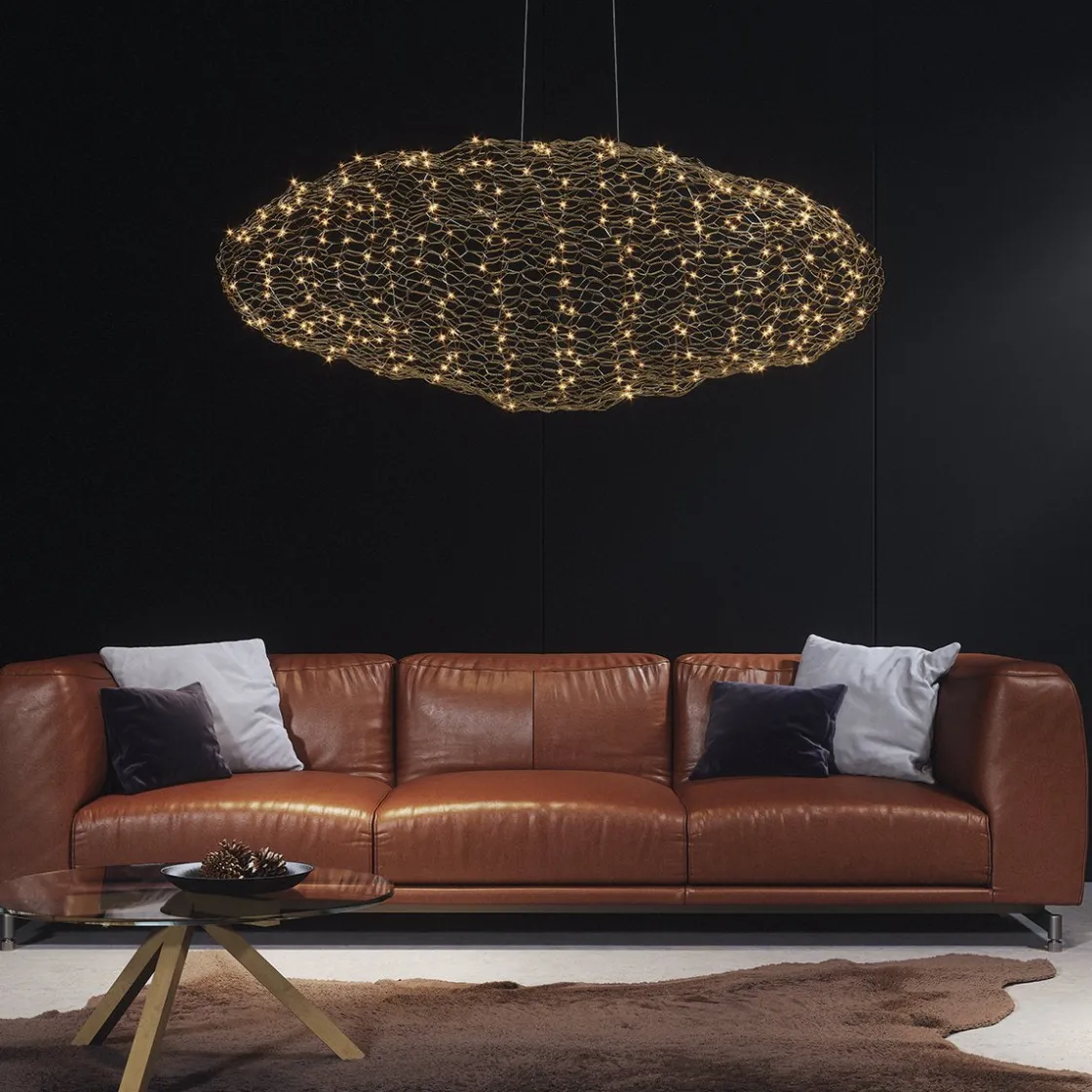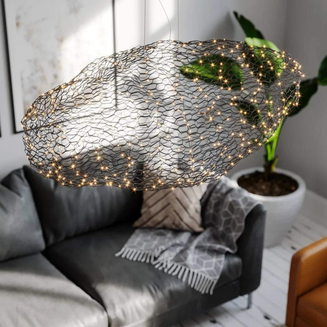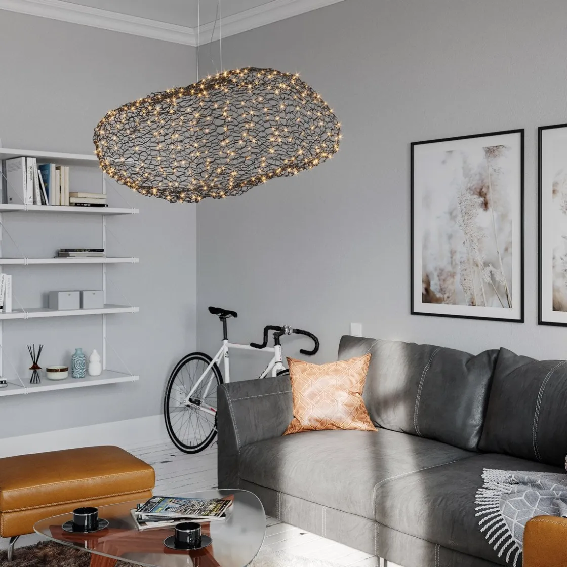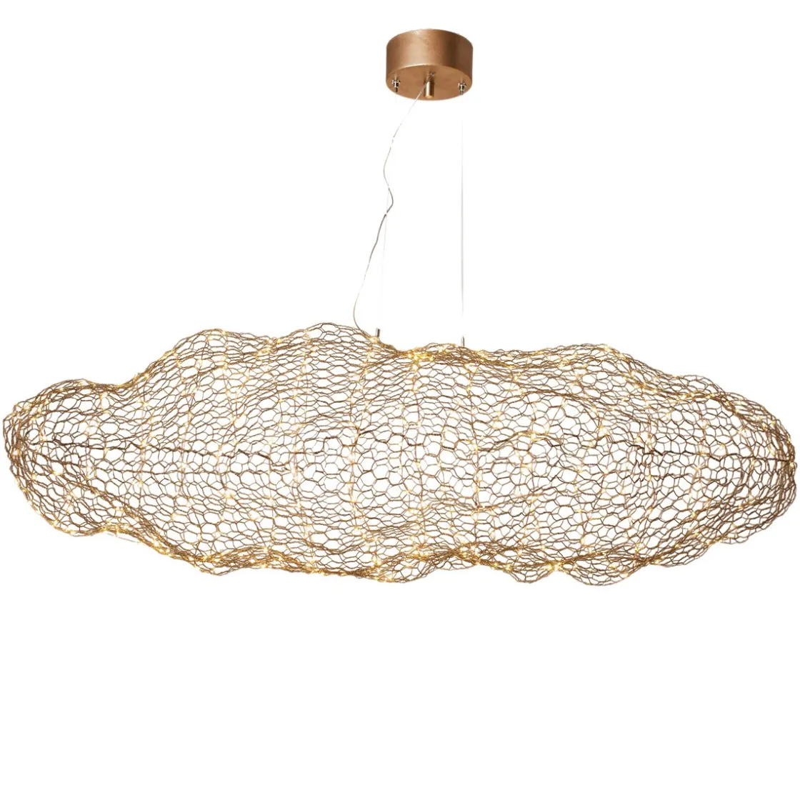 Hayden taklampe L115cm er en håndlaget lampe der hvert eksemplar er unikt. Den luftige designen gjør at lampen passer i både store og små rom, siden den slipper igjennom lys og ikke skygger for omgivelsene. Hayden taklampe L115 cm er utstyrt med 400 LED-punkter og utstråler et varmt, behagelig lys. Vi anbefaler at du kobler taklampen til en dimmer, slik at du kan endre lysstyrken etter behov.