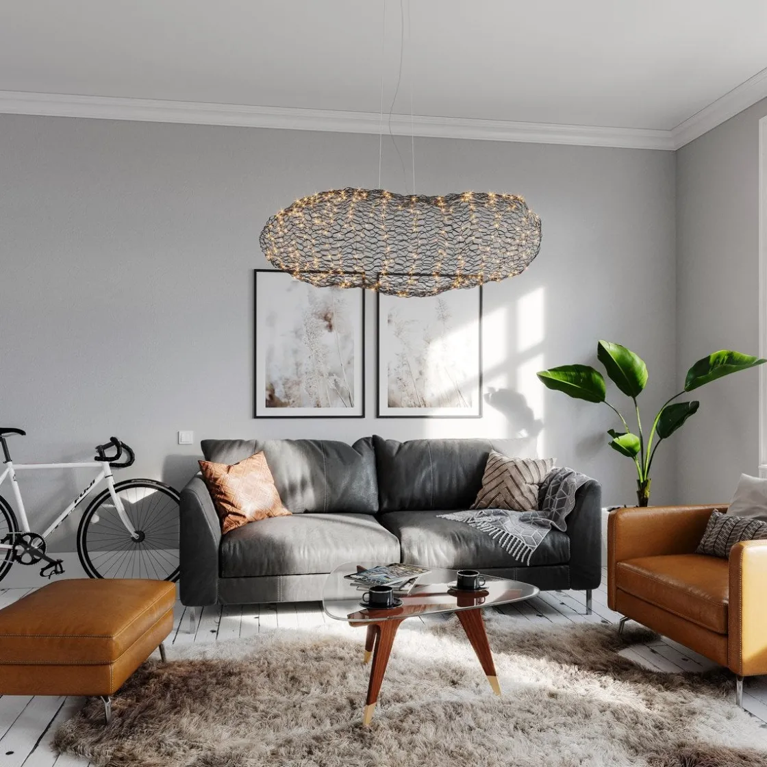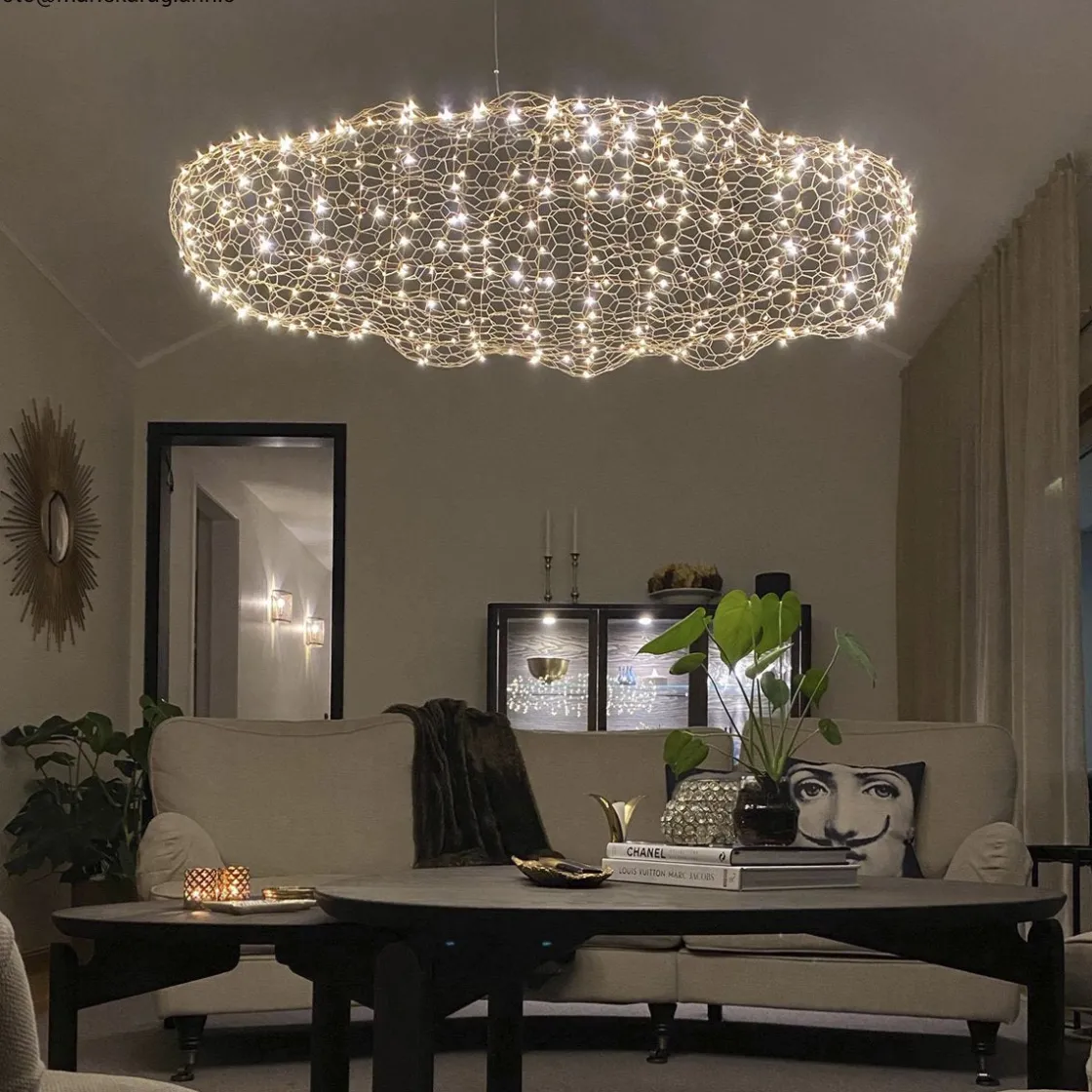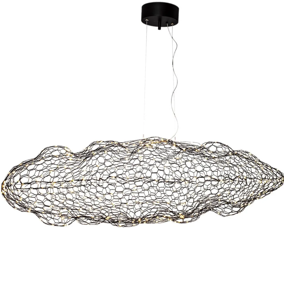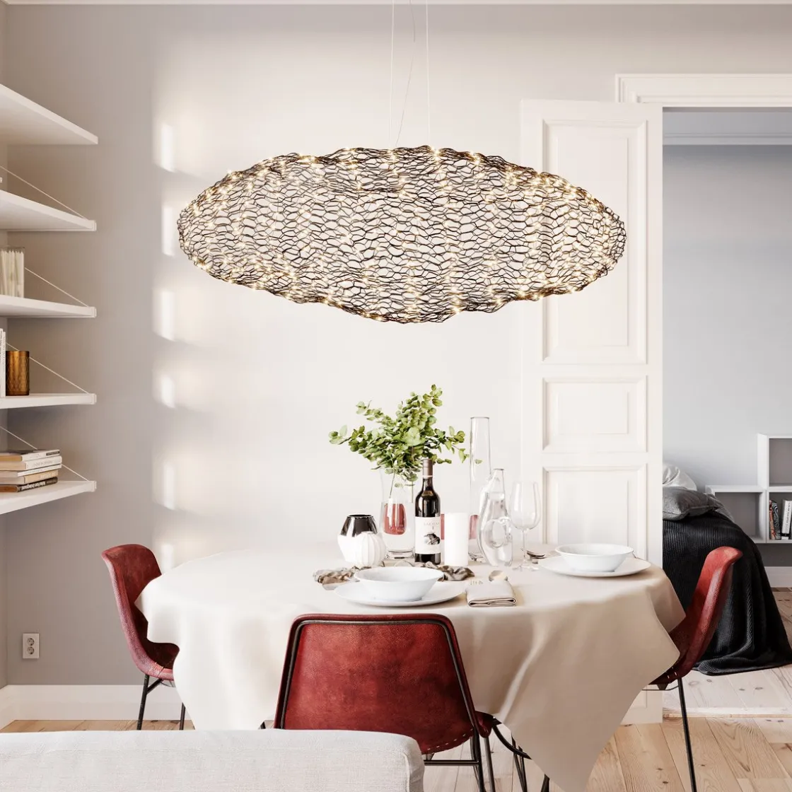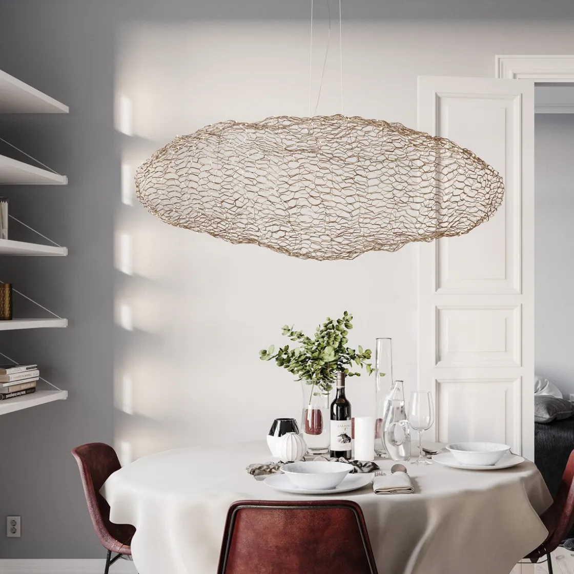 Hayden taklampe L115cm er en håndlaget lampe der hvert eksemplar er unikt. Den luftige designen gjør at lampen passer i både store og små rom, siden den slipper igjennom lys og ikke skygger for omgivelsene. Hayden taklampe L115 cm er utstyrt med 400 LED-punkter og utstråler et varmt, behagelig lys. Vi anbefaler at du kobler taklampen til en dimmer, slik at du kan endre lysstyrken etter behov.