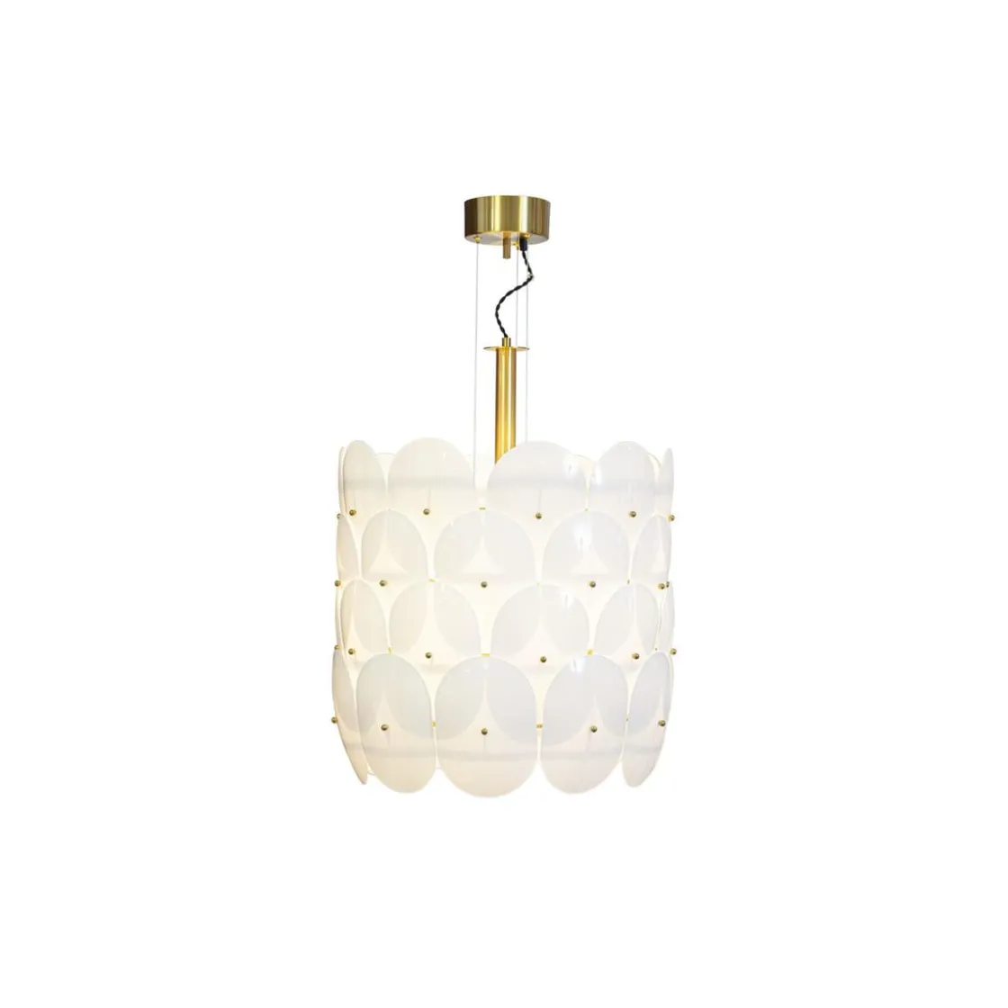 Lampeskjermen i opalhvitt glass sprer et mykt og behagelig lys som skaper en varm og innbydende atmosfære. De elegante messingdetaljene tilfører en følelse av sofistikert, mens de tvinnede tekstilkablene i harmoniske fargetoner gjør lampen både funksjonell og estetisk tiltalende.
