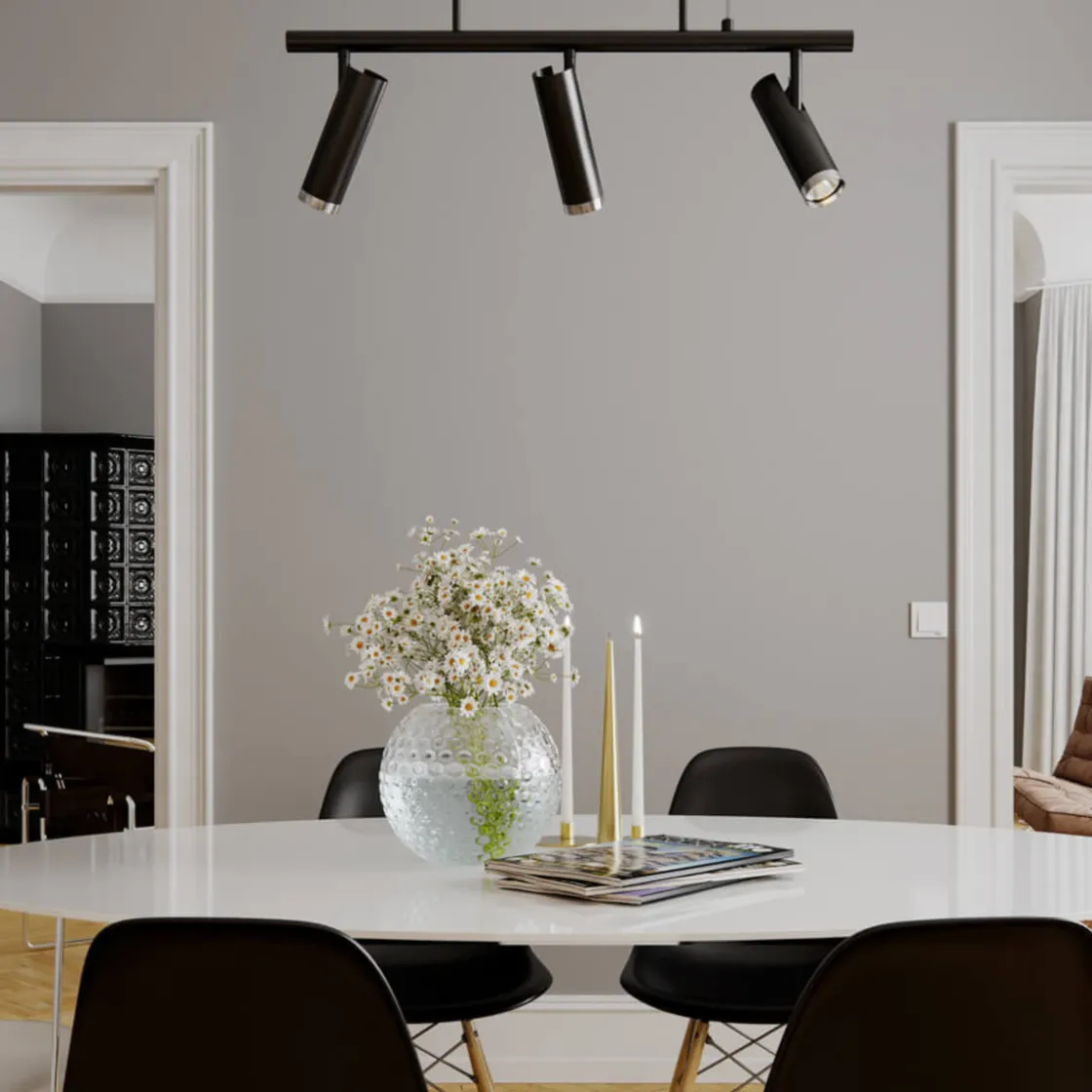 Taklampen Puls Bar er tilgjengelig i to elegante farger, sort og hvit, slik at du enkelt kan matche den med ditt interiør og skape en harmonisk atmosfære i rommet. For å sette et personlig preg, er det en utskiftbar dekorring nederst på hver spotlight, som gir deg muligheten til å tilpasse lampen etter din stil og preferanser. Taklampe Puls Bar er ikke bare en praktisk belysningsløsning, men også en stilig interiørdetalj som vil fremheve estetikken til rommet ditt. Med sin justerbare funksjonalitet og mulighet for personalisering er denne lampen et utmerket valg for å skape den perfekte belysningen og atmosfæren i hjemmet ditt. Velg Puls Bar og la hjemmet ditt skinne med stil og eleganse
