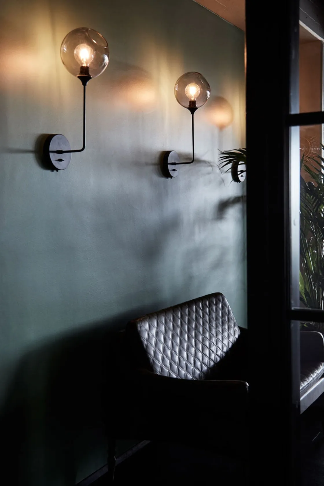 Ballroom Vegglampe er ideell som vegglampe ved sengen, i gangen eller hvor som helst en vakker vegglampe er nødvendig. Vegglampen er i samme serie som ballroom taklamper og ballroom Molecular. Vegglampen er hådblåst og håndmalt, derfor er lampen helt unik og kan variere litt i farge og størrelse.