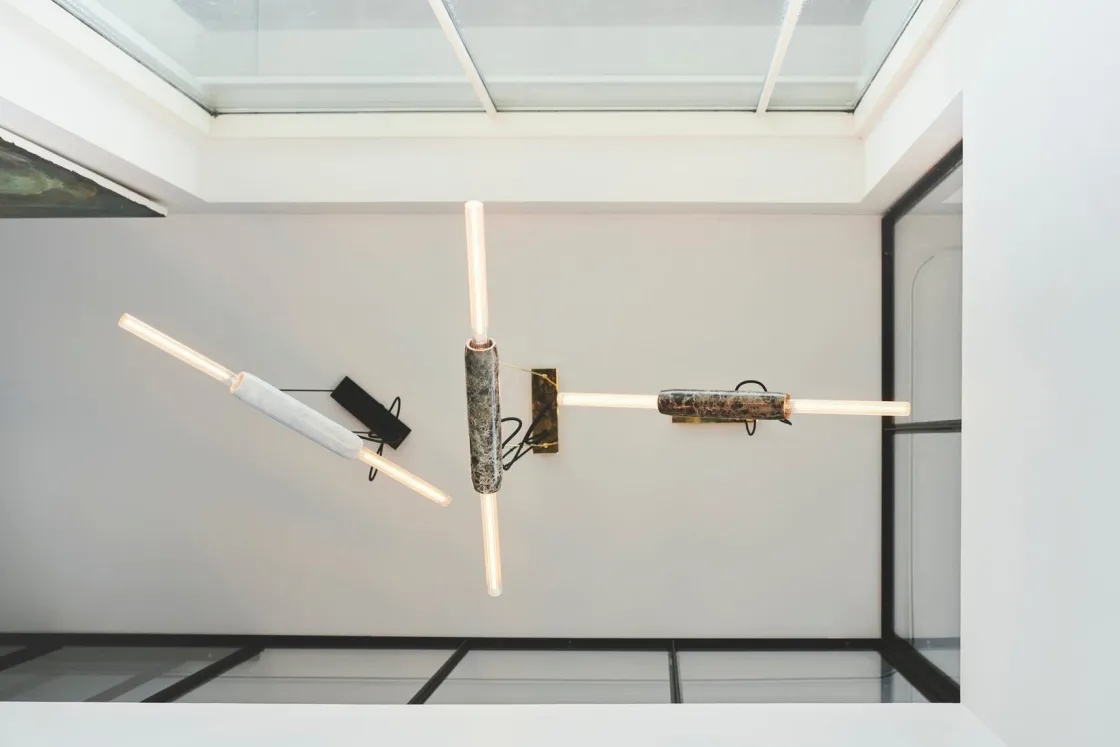 Limbo taklampe fra Design By Us har ingen fast retning, derav navnet på lampen. Den kan henges i alle retninger – opp, ned, vertikal eller horisontal. Den håndkuttede marmorbasen er ledsaget av to spesiallagde lyspærer som skaper det kunstneriske utseendet til Limbo. Lampen vil balansere vakkert over spisebordet, på kjøkkenet eller i gangen.