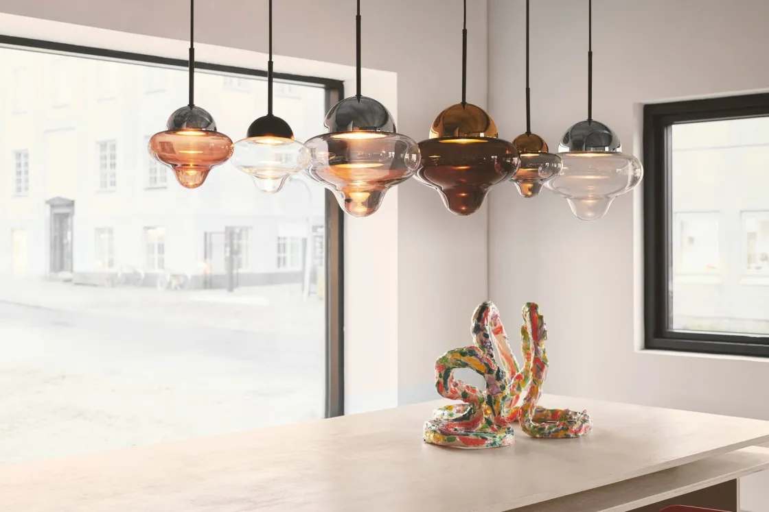 - Materiale: Munnblåst glasskuppel, belagt metall og integrert LED