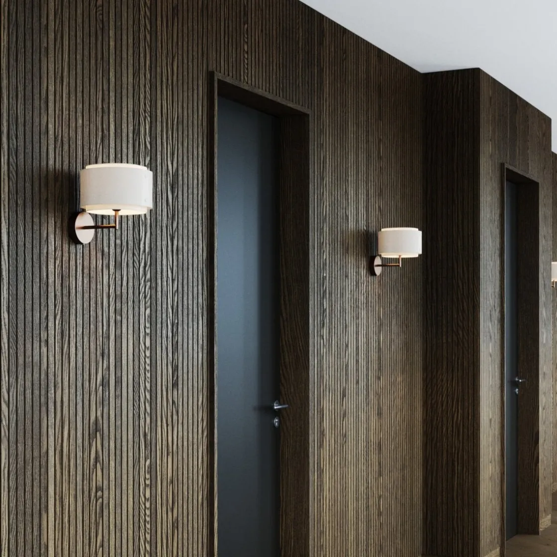 Takai vegglampe fra Studio Mavro//Lefèvre av Sofie Lefèvre har en stoffskjerm med en vakker form som inviterer deg til å betrakte den fra mange ulike vinkler. Kombinasjonen av linskjermen og den polerte messingbasen skaper et veldig mykt og varmt designspråk.