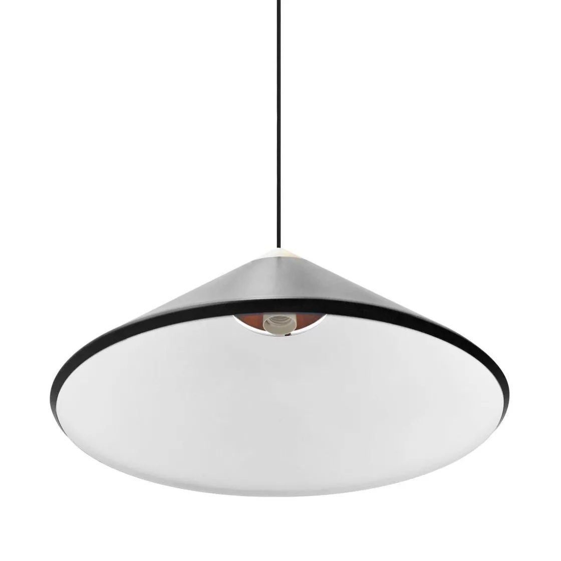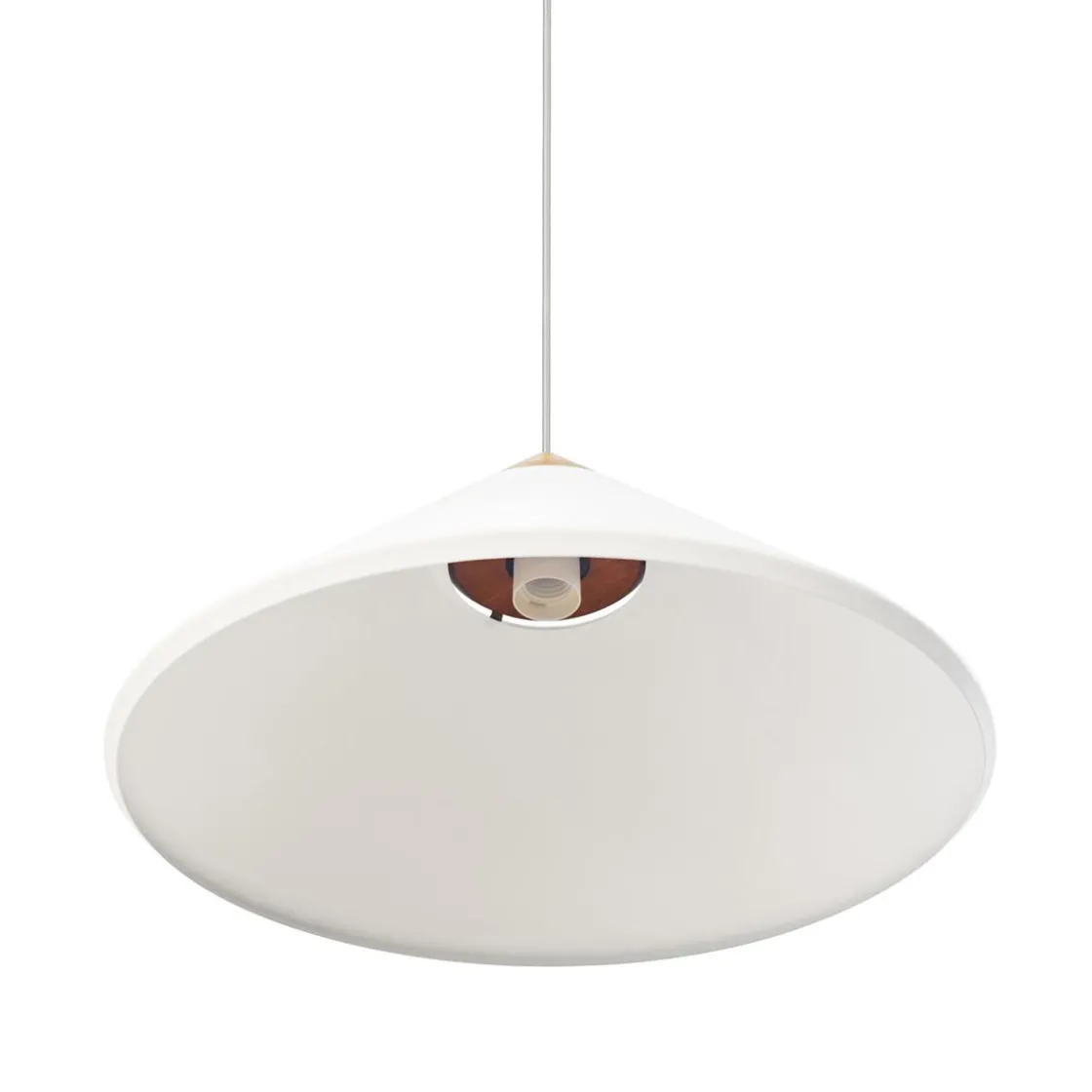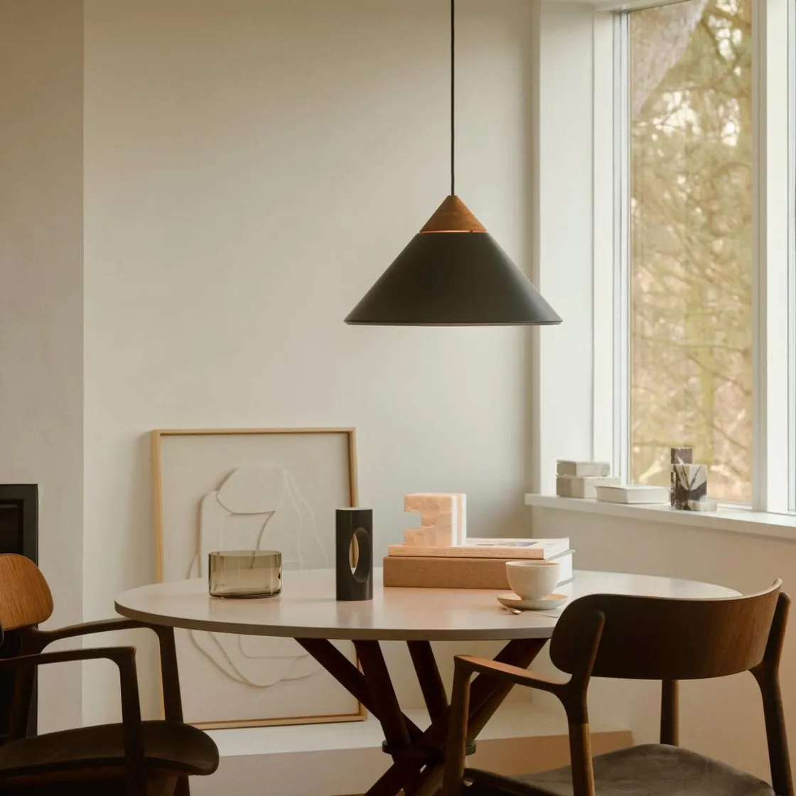 Kinto er designet av Bjørn + Balle i et moderne og minimalistisk design. Den kjegleformede skjermen er utført i metall med en elegant topp i mørkt tre og detaljer i polert messing. Lyset skinner gjennom åpningen på toppen av skjermen og skaper en vakker lyseffekt. Perfekt over spisebordet eller kjøkkenbordet.