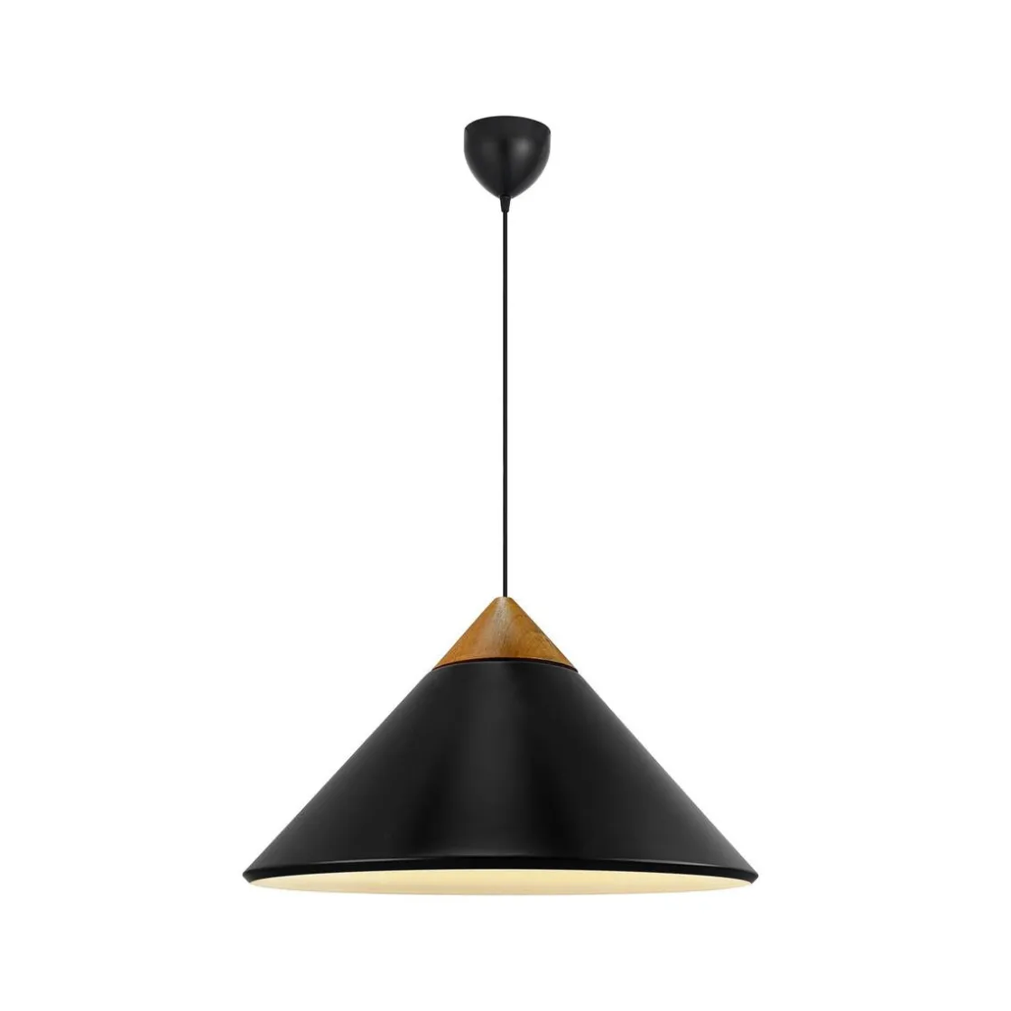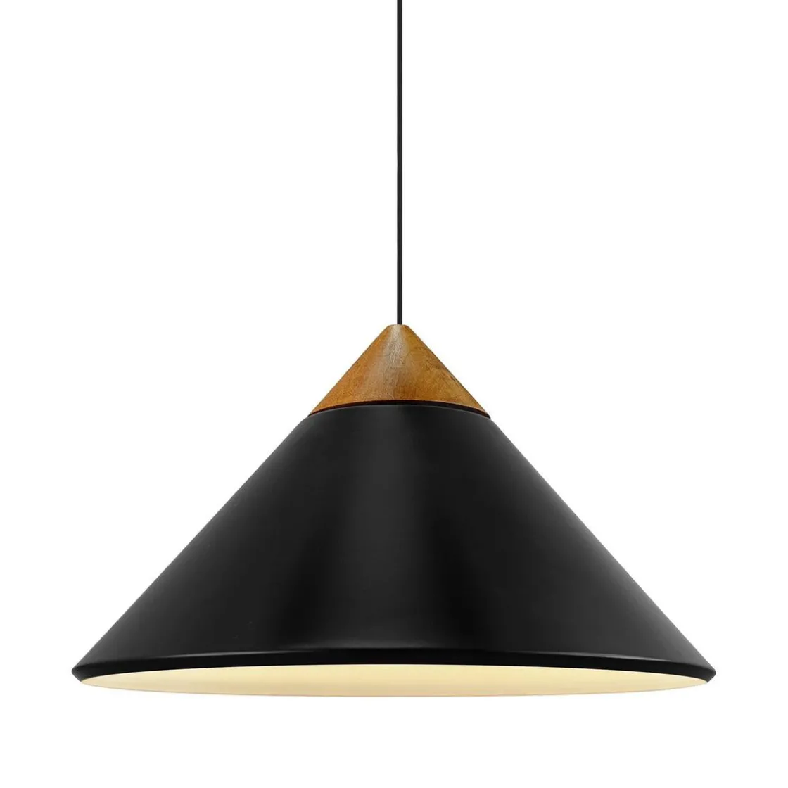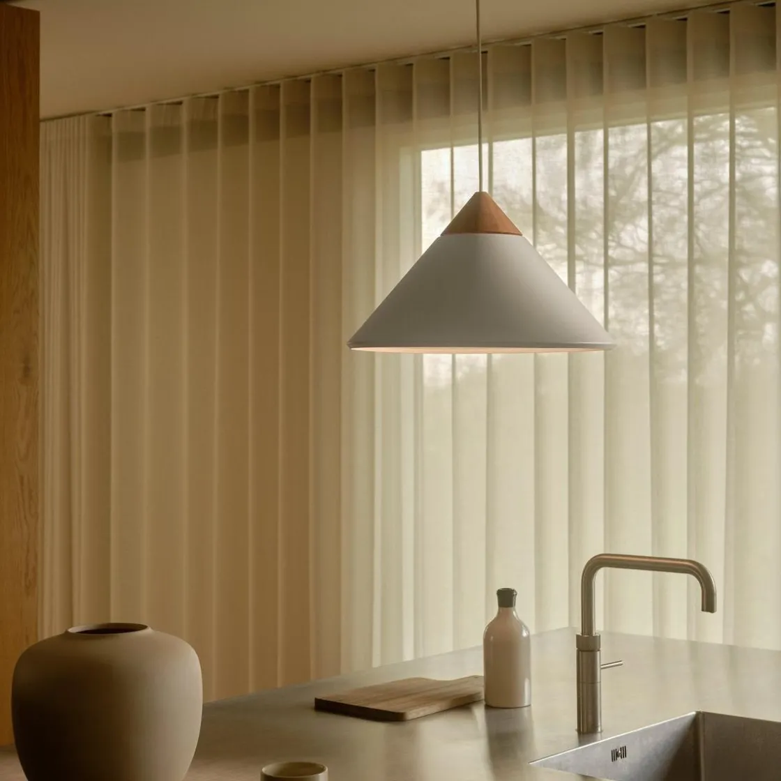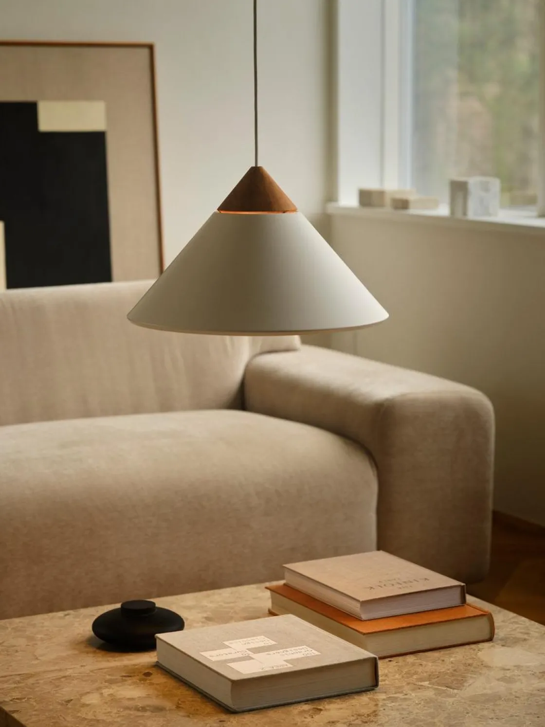 Kinto er designet av Bjørn + Balle i et moderne og minimalistisk design. Den kjegleformede skjermen er utført i metall med en elegant topp i mørkt tre og detaljer i polert messing. Lyset skinner gjennom åpningen på toppen av skjermen og skaper en vakker lyseffekt. Perfekt over spisebordet eller kjøkkenbordet.