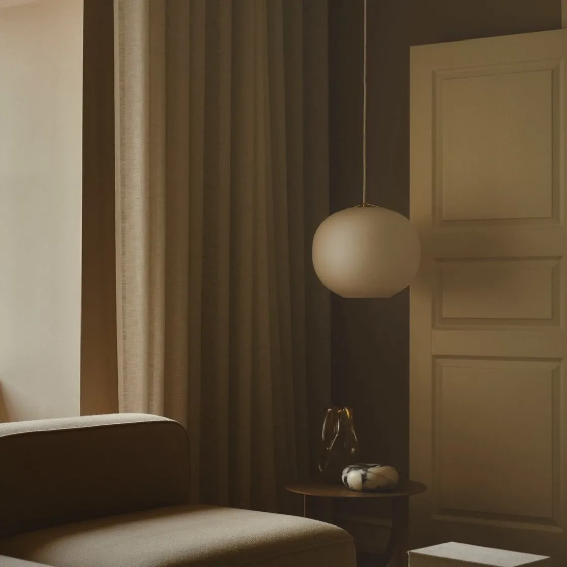 Navone er designet av det danske designstudioet Studio Mavro//Lefèvre by Sofie Lefèvre. Den generelle formen på skjermen er myk og rund, men den svært subtile buede bunnen tilfører en ny interessant dimensjon som forvandler lampen til mer enn bare en kule. Messingdetaljene tilfører et moderne preg, og understreker lampens avbrutte lyshet.