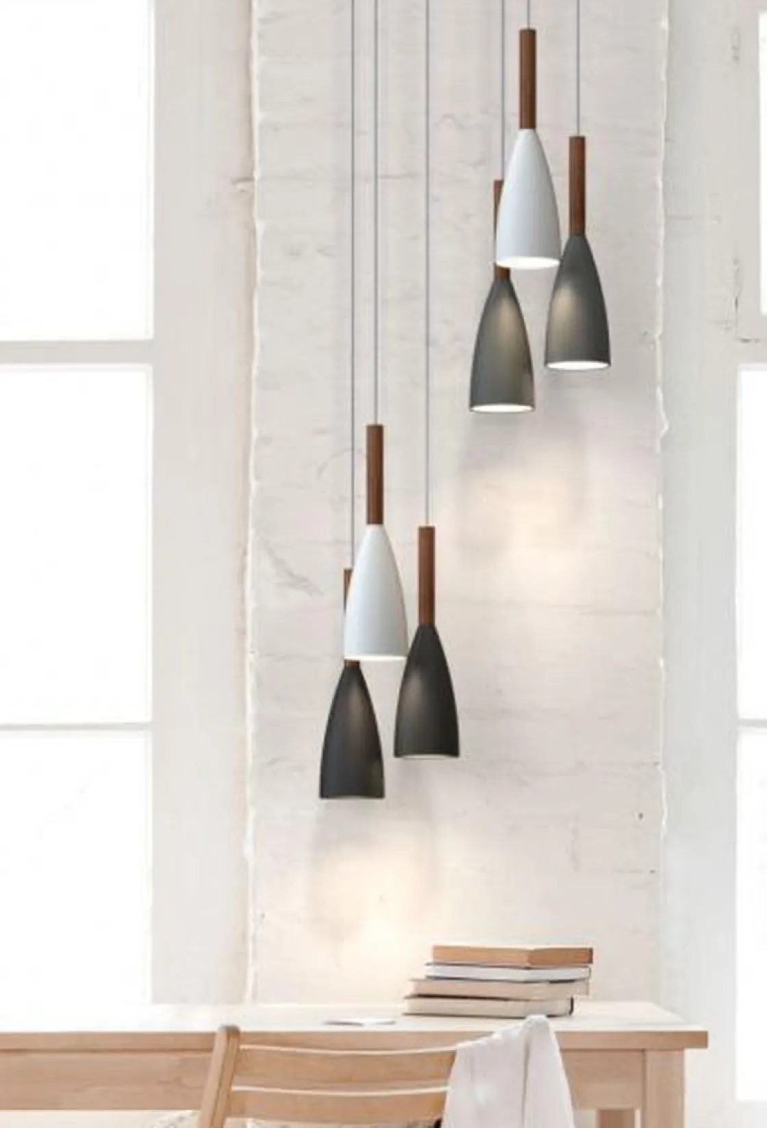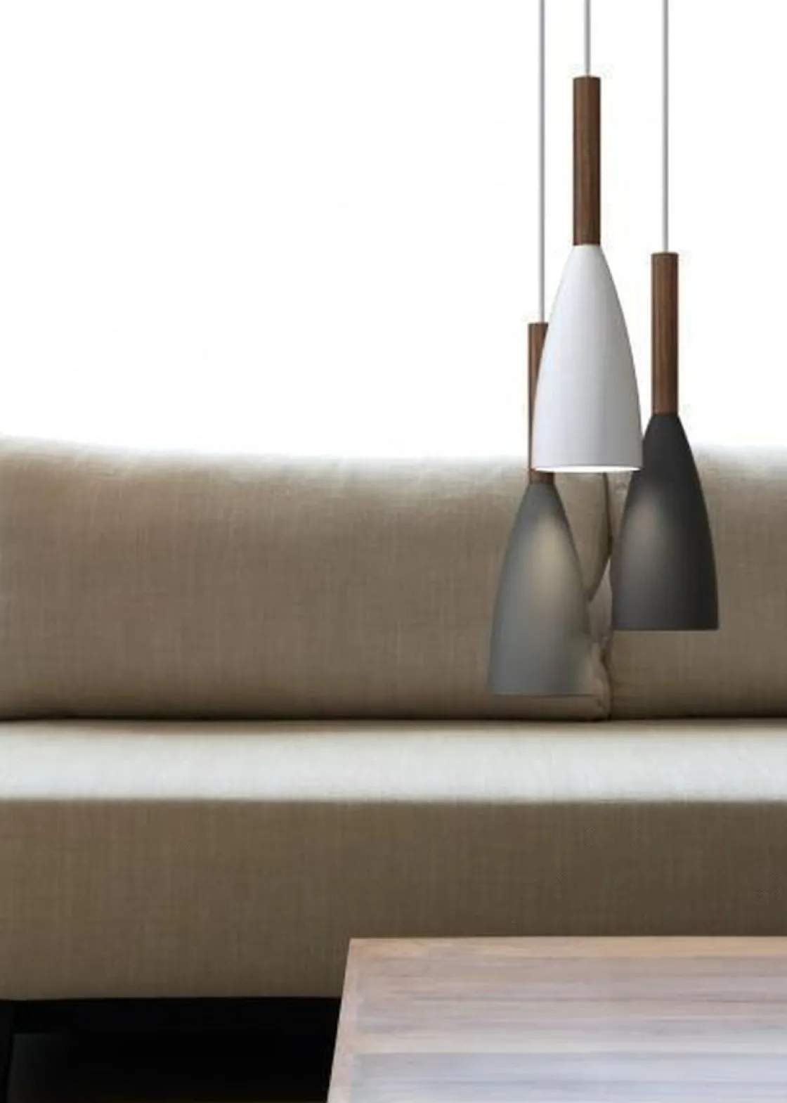 Pure pendel er en nymoderne takpendel laget i hvitt metall og oljet valnøtt. Pendelen finnes også i grått- eller svart metall.