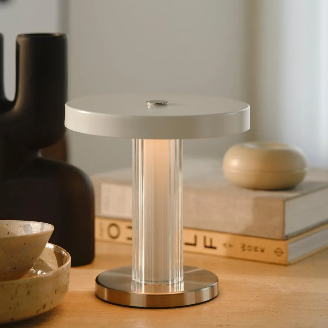 Denne elegante, transportable lampen, Trezzi, er designet av den danske designduoen Anker Studio. Trezzi er utført i et moderne og elegant design som med sitt riflede glass henter inspirasjon fra vintage Art Deco-stil. Demp lyset i tre trinn på bryteren for å skape den perfekte stemningen. Lampen lades enkelt med den medfølgende USB-kabelen.