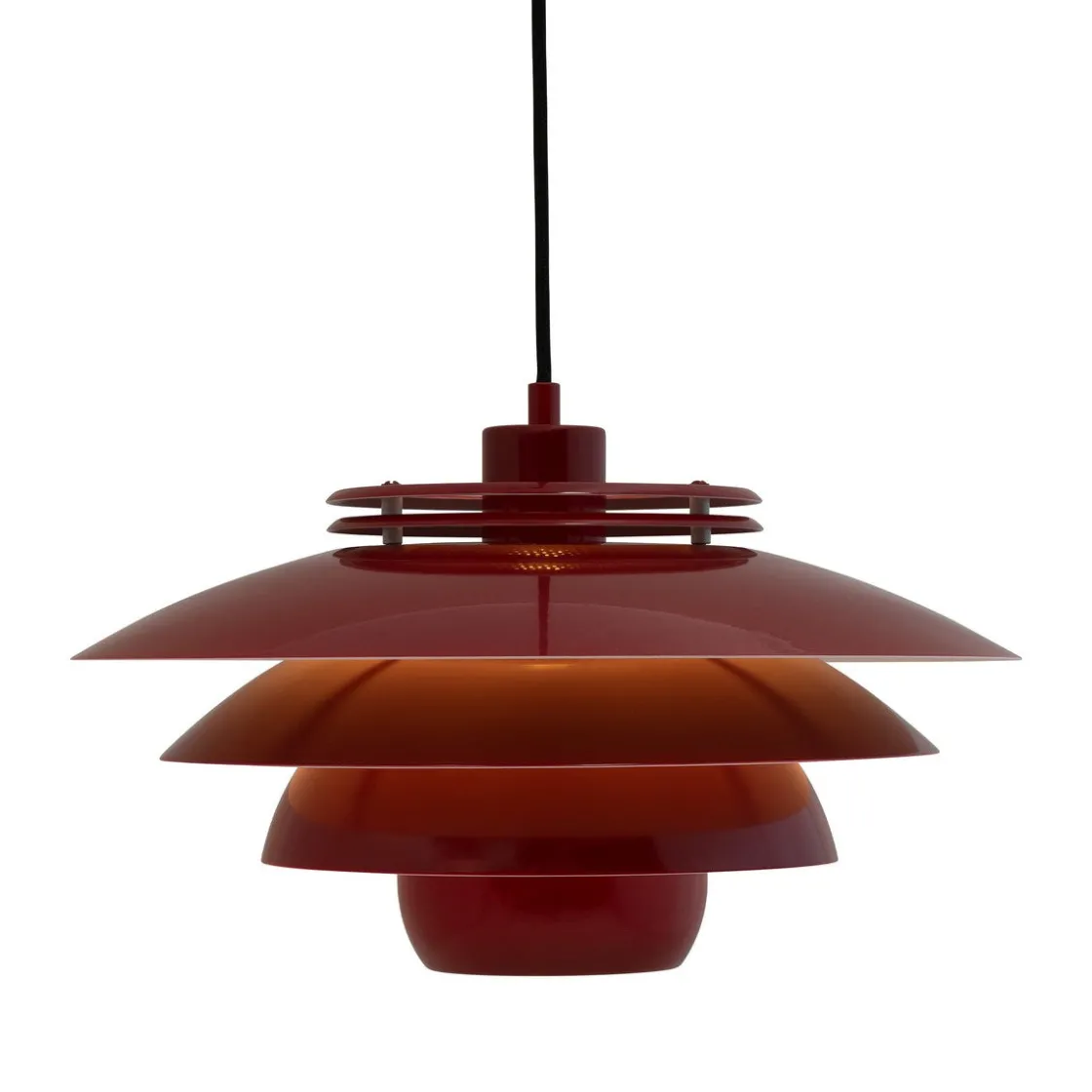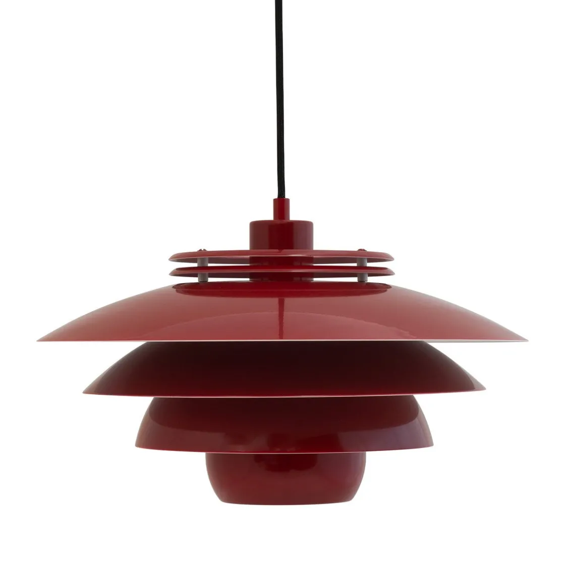 Ejka er en vakker pendel i mørkerødt metall. Den er åpen i toppen og sprer derfor lyset godt.