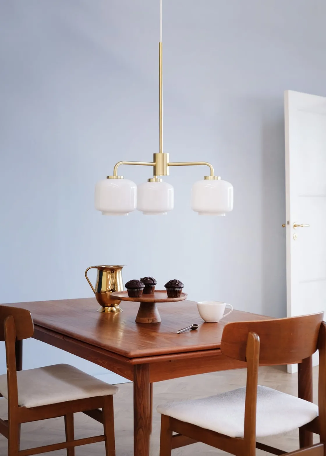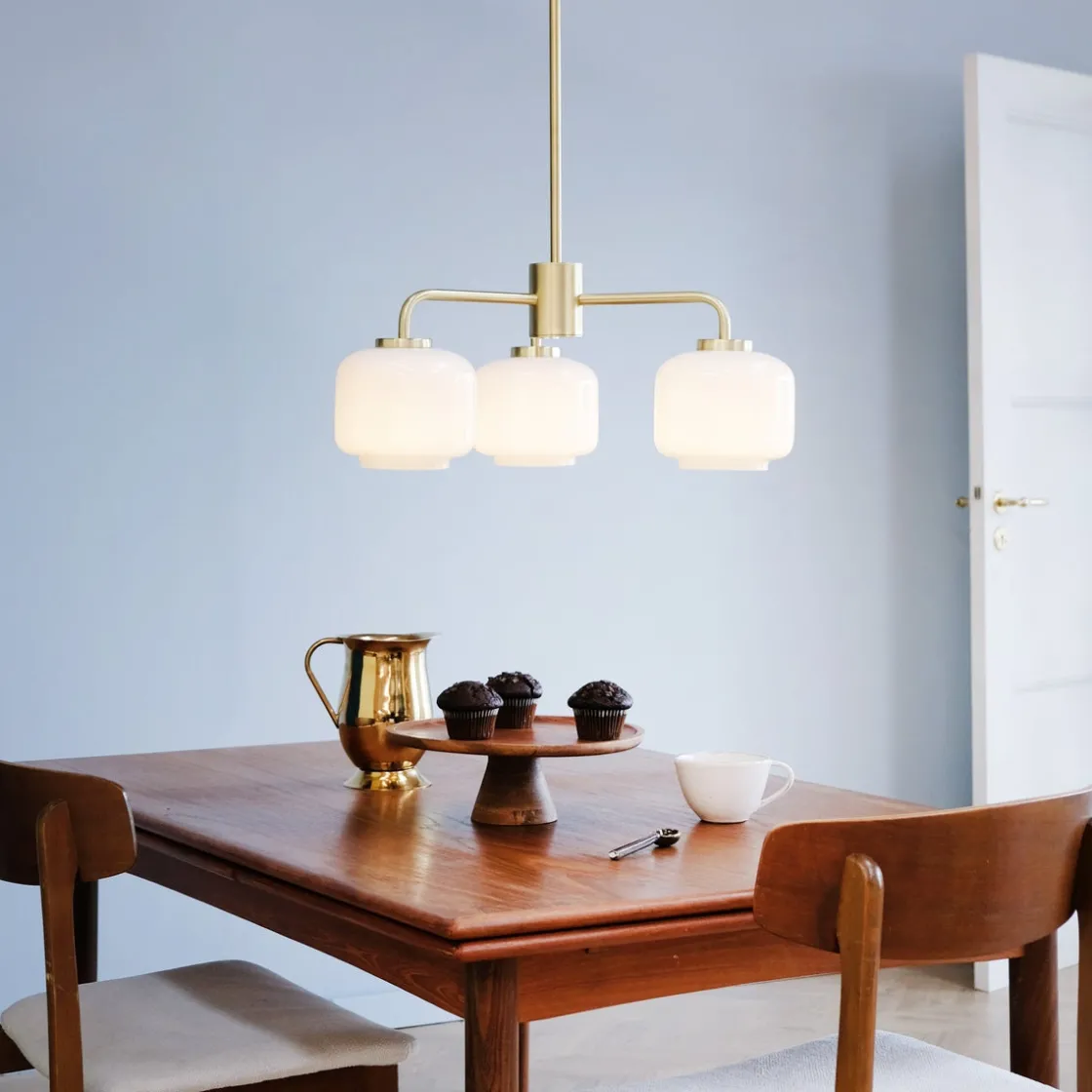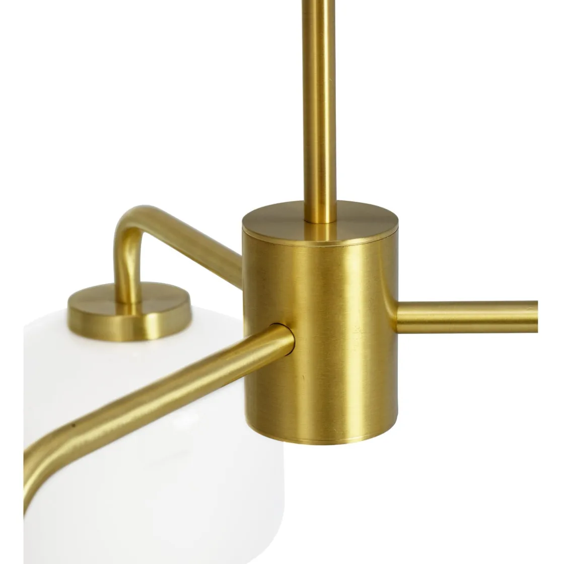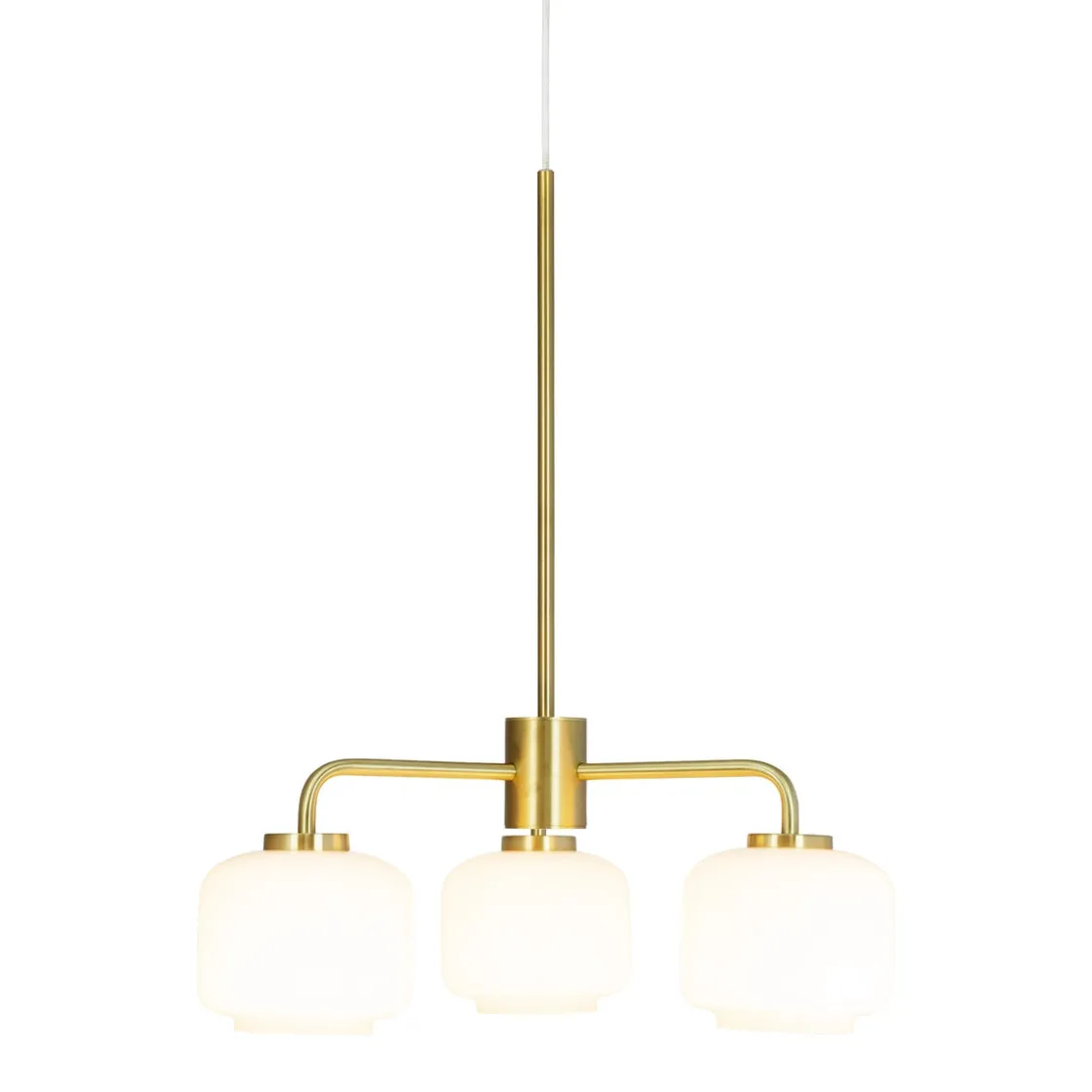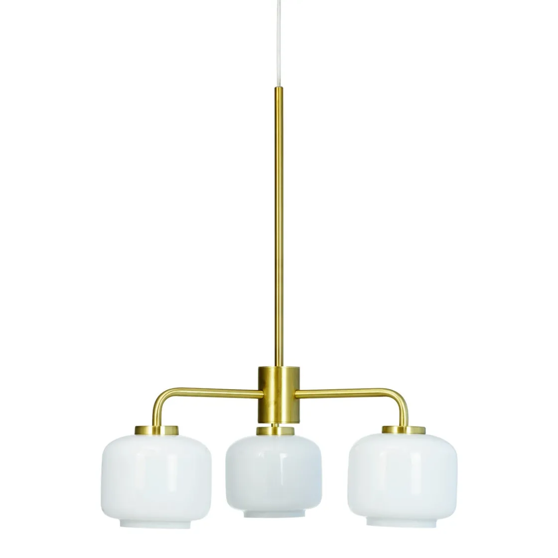 Arp er en klassisk og moderne lysekrone med 3 opal hvite glass kupler. Opphenget er i matt messingfarget.