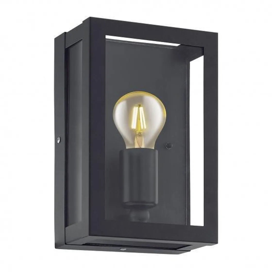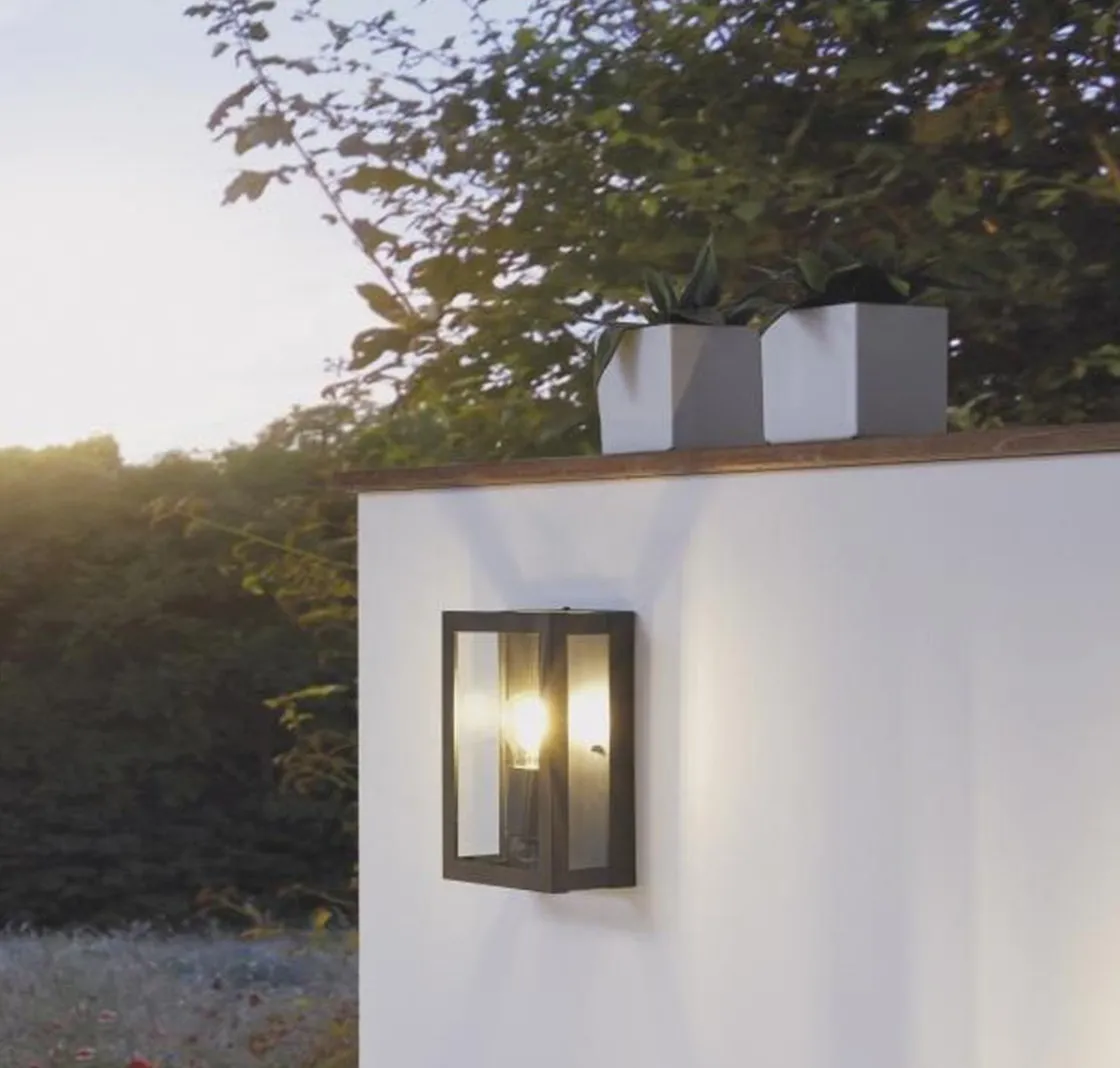 Moderne vegglampe egnet til utendørsbrus, i svartfarget stål og glass. Du behøver en lyspære med E27-sokkel til lampen.