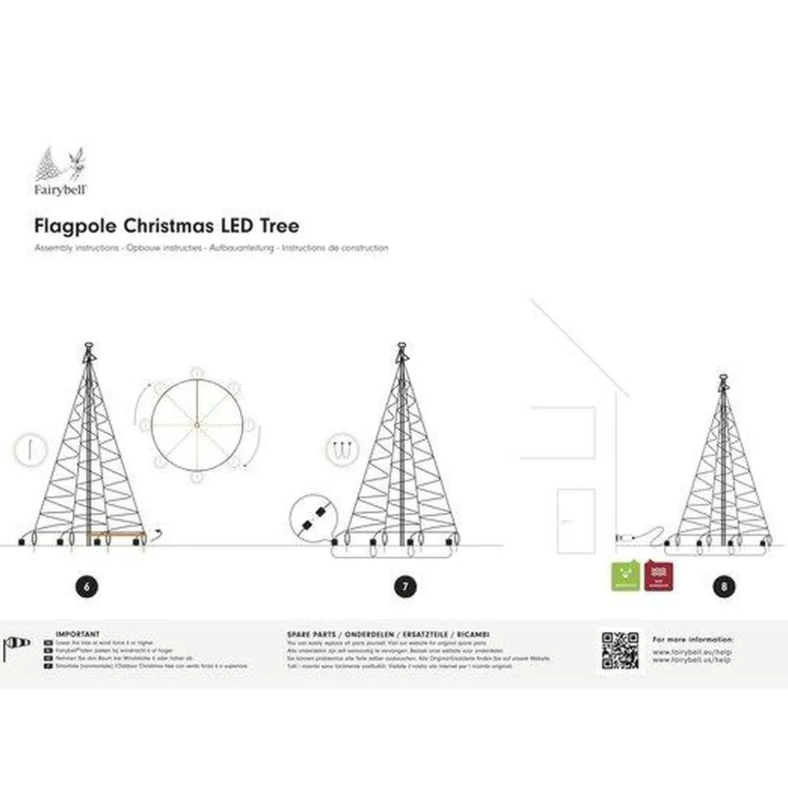 Da er julebelysningen fra Fairybell® virkelig noe for deg! Denne 800CM høye julebelysningen, som er formet som et juletre, har 1500 LED-pærer og tåler så godt som alle slags værforhold. Fairybell® er lett å sette opp, og det tar ikke mer enn 30 minutter, i og med at du heiser opp juletreet i flaggstangen like enkelt som et flagg. Lyslenkene kobles til en spesiell værbestandig 31-volts transformator, som enkelt, eventuelt med en tidsbryter mellom, kan kobles til strømnettet. Etter julefeiringen kan du enkelt oppbevare juletreet i originalesken, slik at du kan ha glede av det i år etter år.