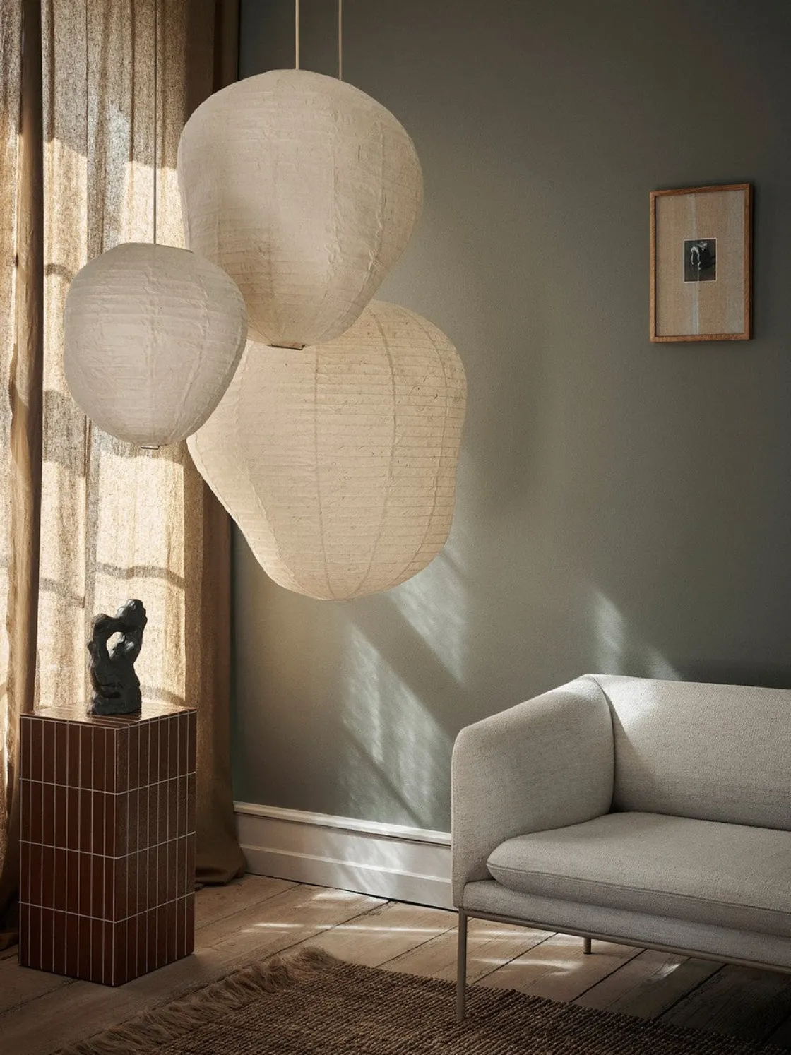 Kurbis taklampe presenterer en sjarmerende vri på den klassiske rispapirlampen. Kurbis har en organisk og asymmetrisk form som gir den et særegent og unikt utseende. Lampen vil gi et mykt og behagelig lys til ethvert rom.