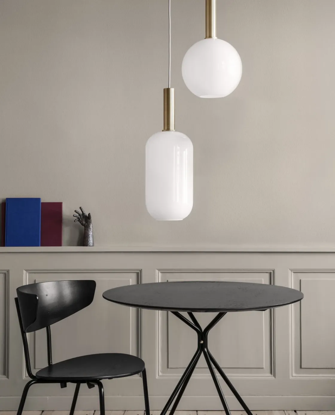 Enkel og pen taklampe fra Ferm Living. Opal glasskjerm og oppheng i messing. Her får du godt og jevt lys til rommet. Fin lampe å bruke i stue, soverom, gang eller over spisebordet.