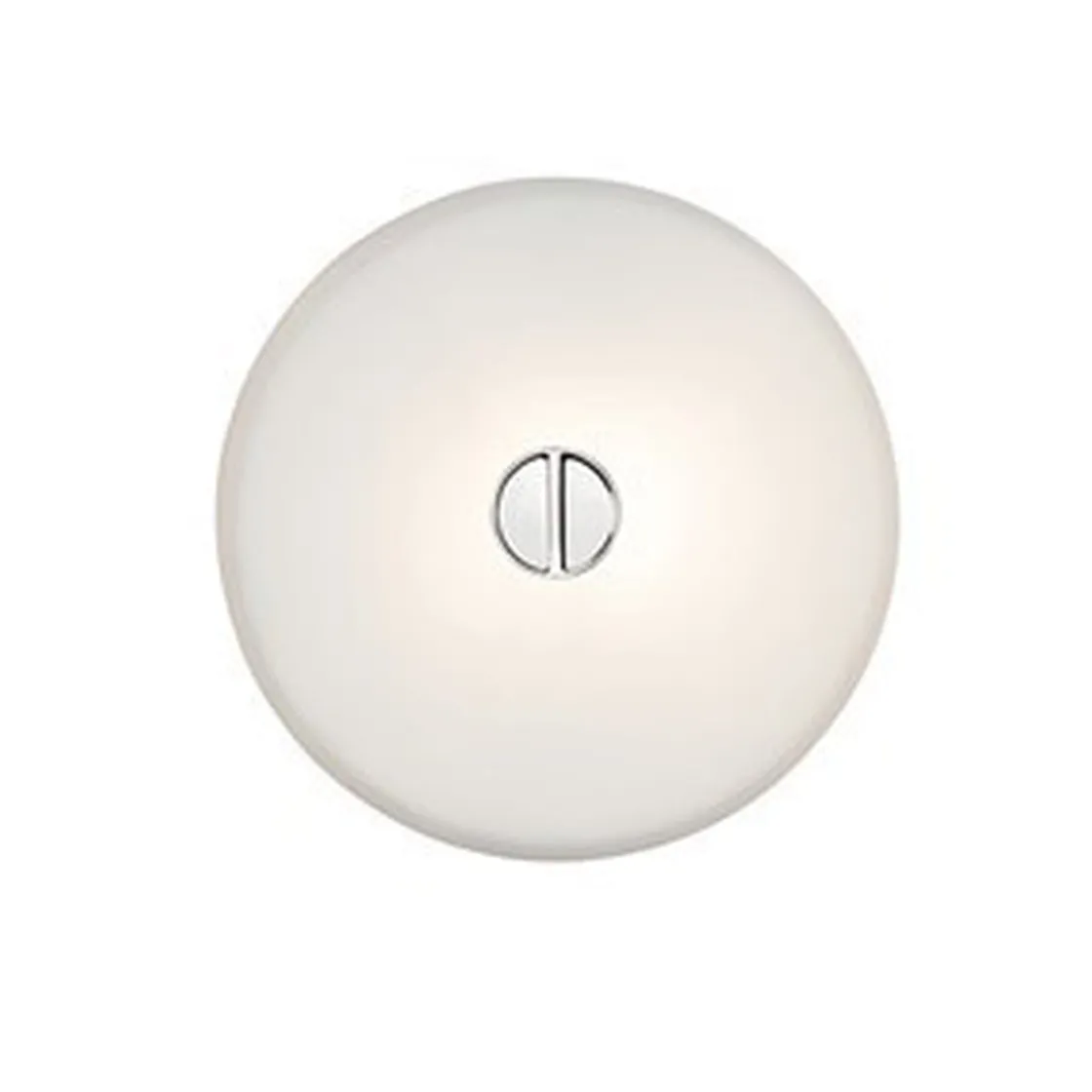 Button tak/vegglampe i glass fra italienske Flos. Denne stilrene lampen gir et diffust og behagelig lys og er fin å dimme. Den kan festes både i tak og på vegg, og den har IP40 slik at den også kan brukes på baderom. Finnes også i en større utgave.Glasset er munnblåst og det er detaljer i stål og blank krom. Designet av Piero Lissono i 2005