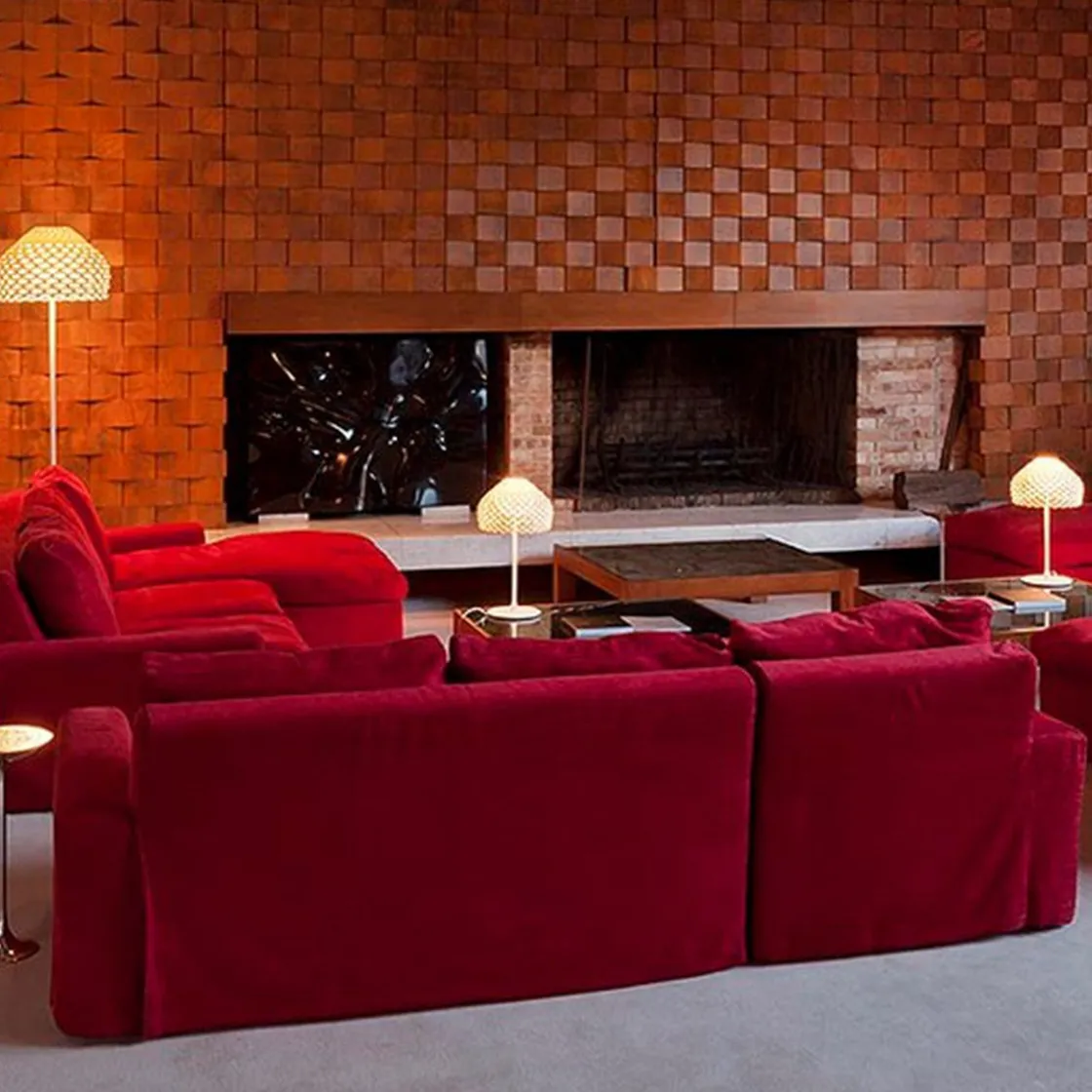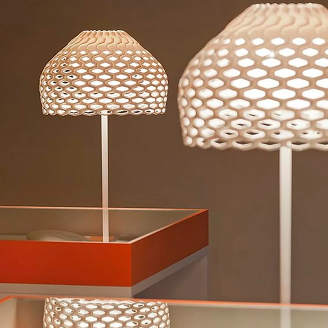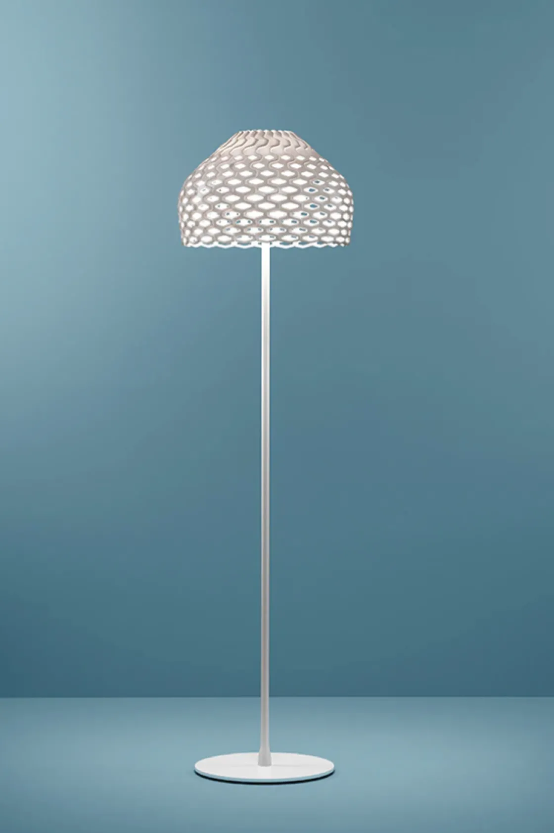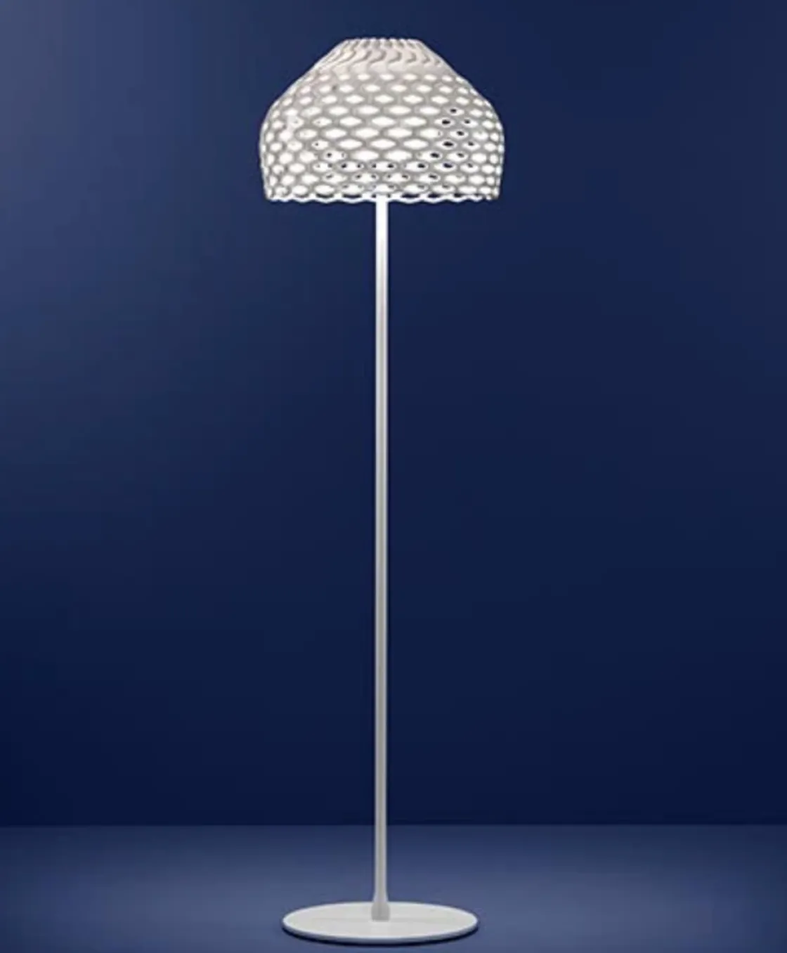 Tatou F ble designet av Patricia Urquiola i 2012, og består av en serie med gulv- pendel og bordlampe. Denne lampen gir hele 205 w med lys, men lyskilden sitter skjult inni en kuppel som mykner lyset slik at man ikke blir blendet selv når lampen står på full styrke. Den perforerte skjermen slipper gjennom lyset slik at en kan skimte kuppelen inni. Det følger med en fotbryter med dimmefunksjon slik at en kan dimme lyset etter behov. Her får man mye generelt lys, men også stemningslys når lampen er dimmet ned.