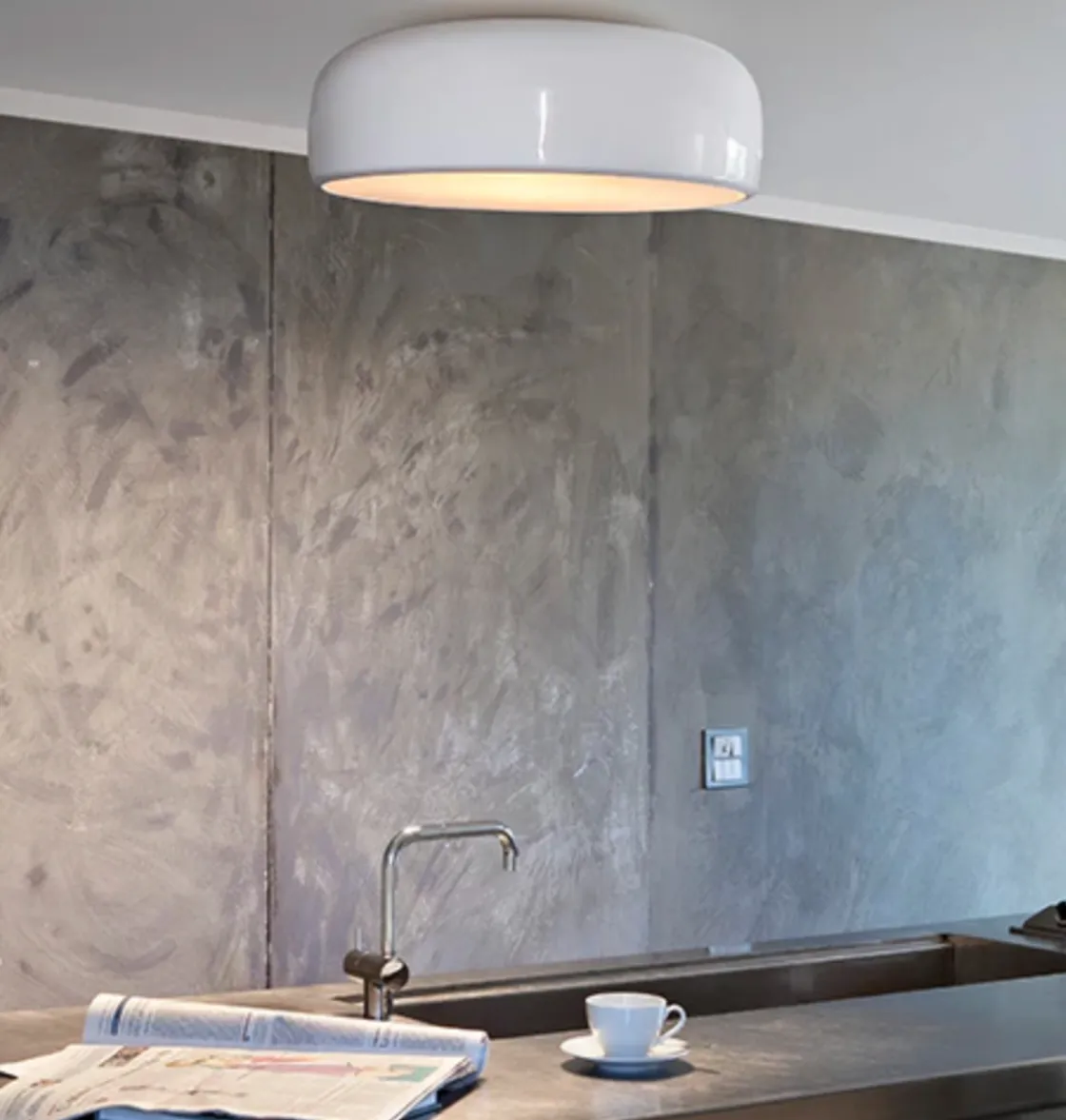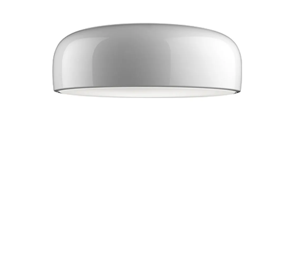 Smithfield takplafond ble designet av Jasper Morrison i 2009. Inspirert av den industrielle stilen, kombinert med mye lys, er dette en lampe som er like ideell i oppholdsrom som på kontoret. Med hele 30 watt LED leverer denne lampen mye lys, med diffuseren under gir lampen et mykt direkte lys uten å blende. Den er fin å dimme slik at en kan få stemningslys eller arbeidslys, etter behov.