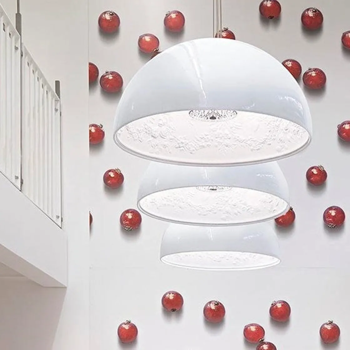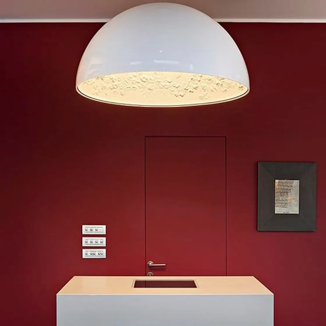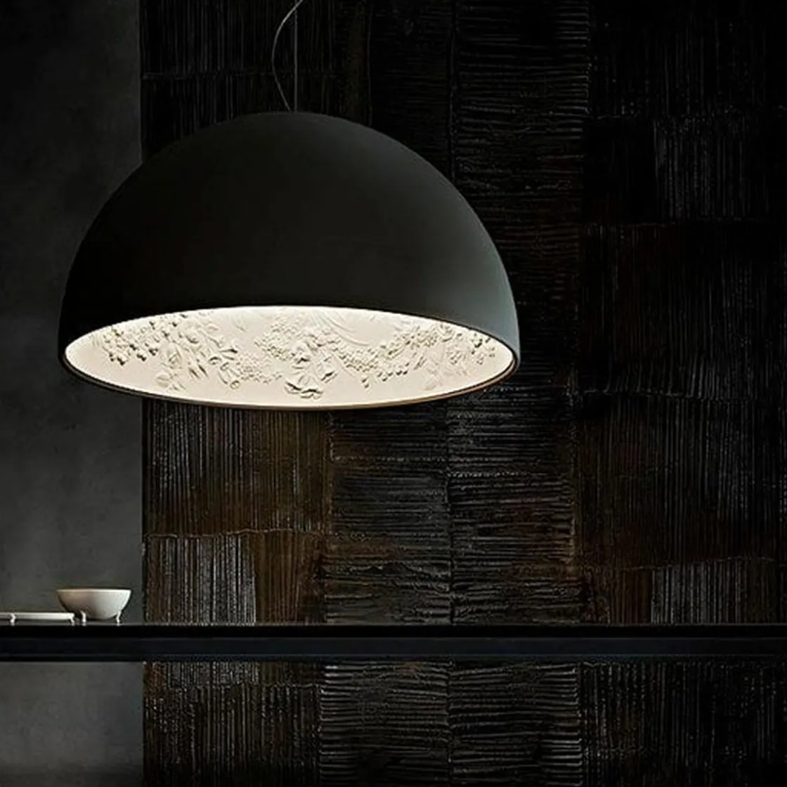 Denne tilsynelatende stilrene lampen med sin enkle kuppelform, skjuler en langt mer finurlig formet innside. Den vakre stukkaturen på innsiden lever godt opp til navnet sitt; Skygarden, og det var nemlig et slikt originalt stukkatur i gammelt et tak som var inspirasjonen til denne lampen.