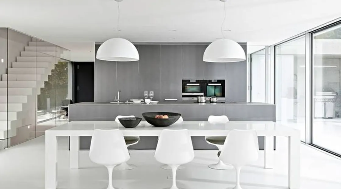- Blank hvitt ytre, gips, rustfritt stål og glass