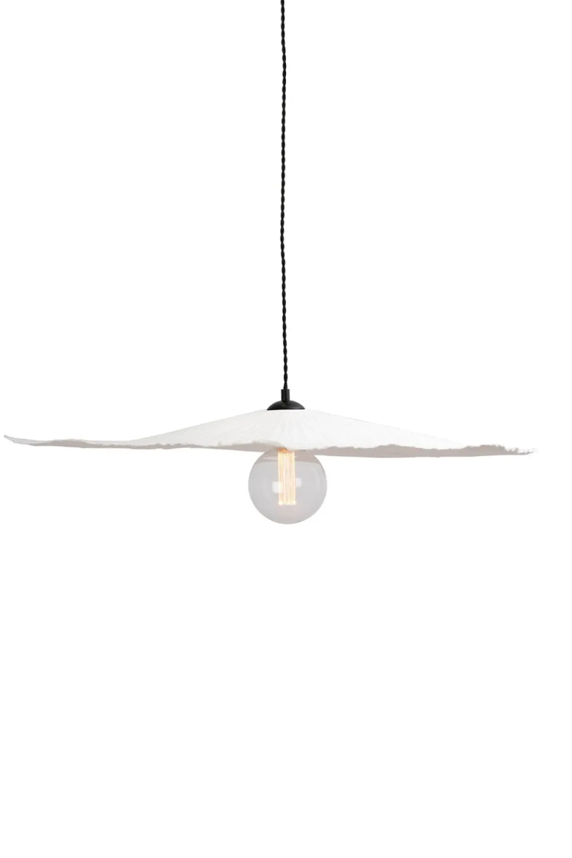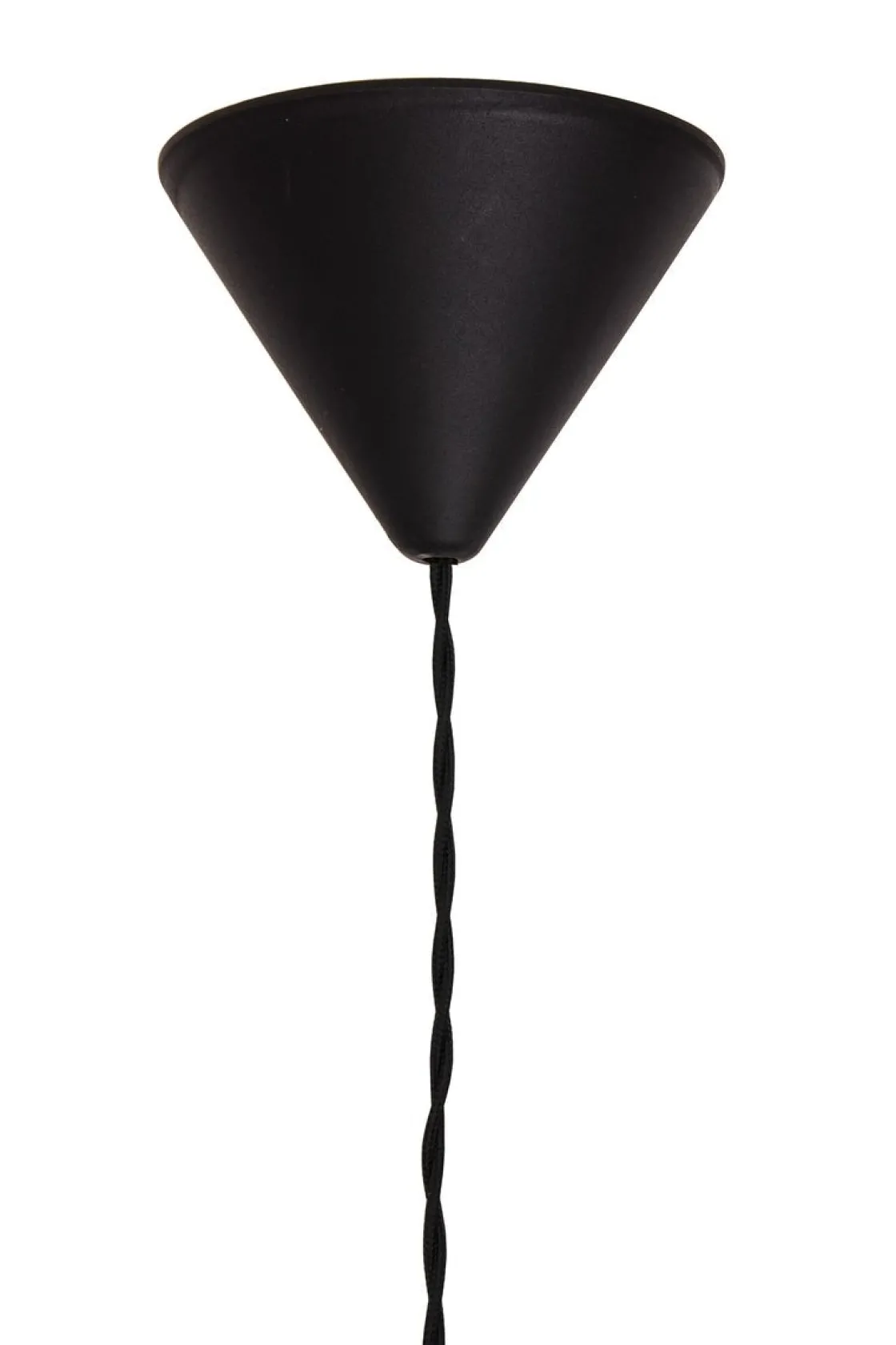 Lampen har en 120 cm lang tvunnet sort tekstilkabel og takkopp i sort plast.