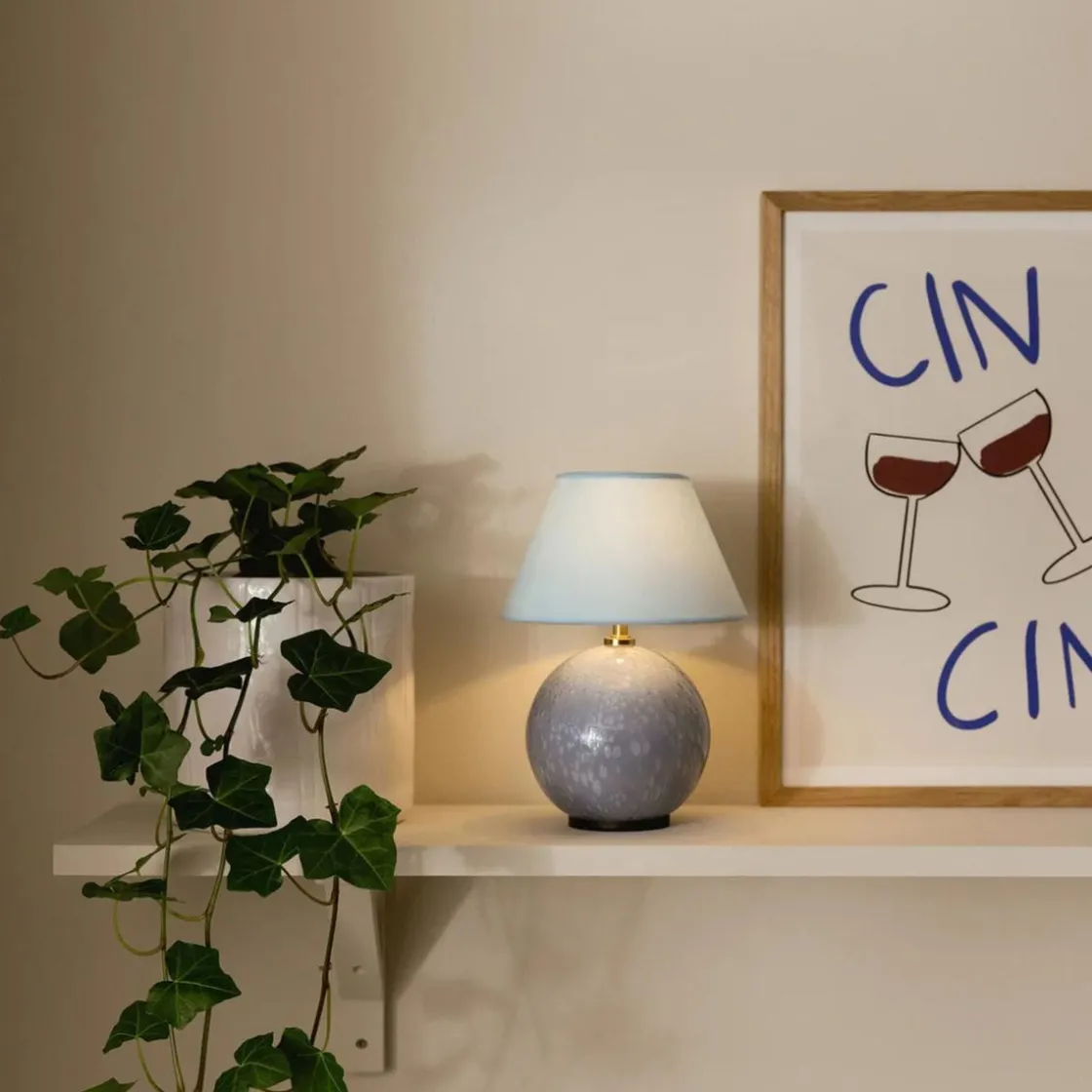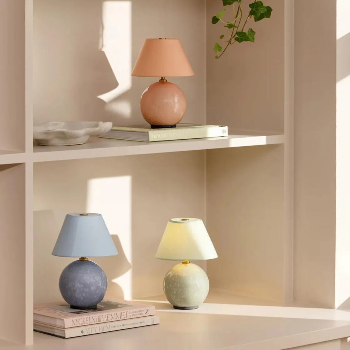 Lampen lades med den medfølgende magnetiske ladekabelen (veggadapter medfølger ikke). Vær oppmerksom på at fargen og luftboblene i glasset varierer, noe som skaper et unikt mønster for hver lampe – derfor kan den du mottar avvike noe fra bildene.