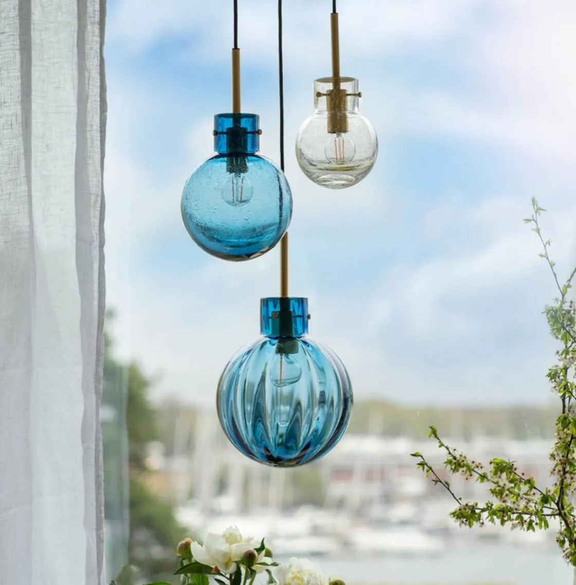 I denne kombinasjonen er det brukt følgende krystallkuler: Optikk stålblå 200 mm, Soda stålblå 160 mm og Soda klar 120 mm. Messingoppheng til 3 krystallkuler med sort tekstiltrukket kabel på 3 meter. Rund takbaldakin 34cm.