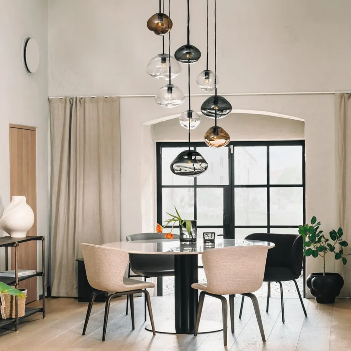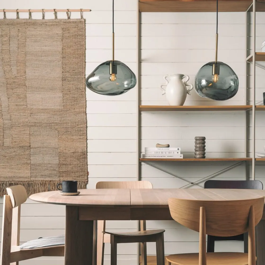 Nyt en sofistikert og elegant atmosfære med røkgrå glasspendellampe.