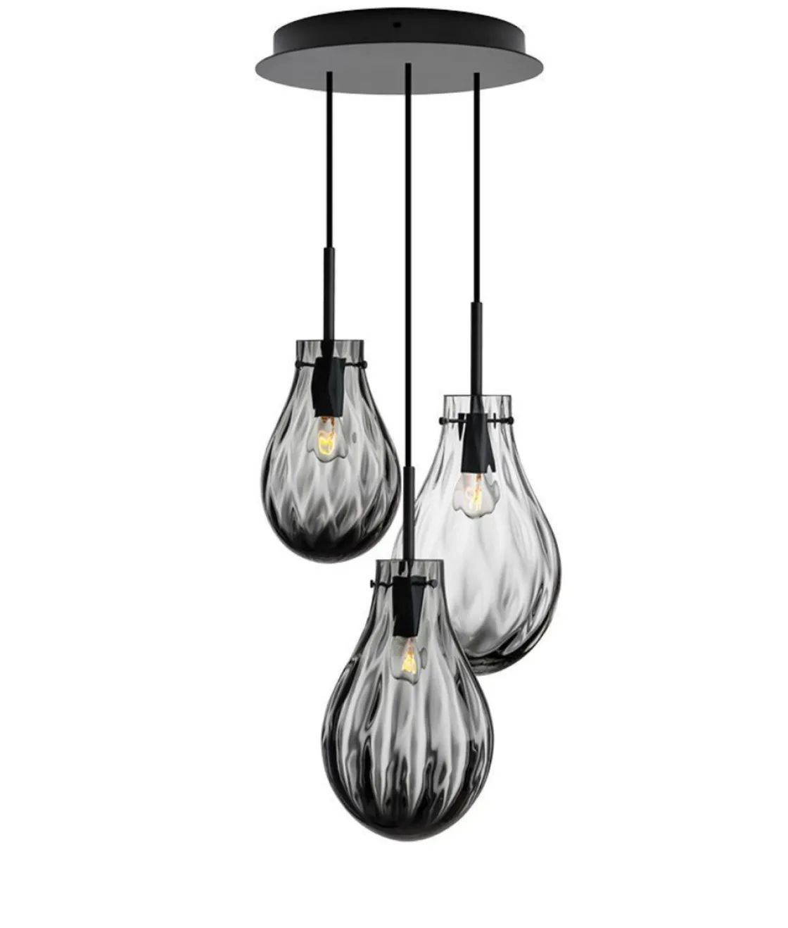 1 stk Dråpe stor i Røkgrå Dobbeltoptikk, 1 stk Dråpe stor lys Røkgrå Dobbeltopptikk, 1 stk Dråpe liten Røkgrå Dobbeltoptikk, Sort oppheng til 3 dråpelamper med sort tekstiltrukket kabel på 3 meter, Sort, rund takbaldakin på 34 cm