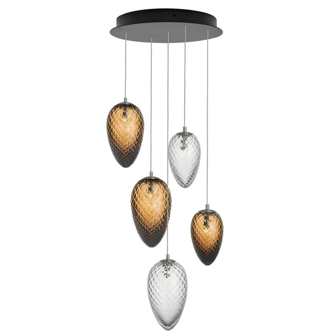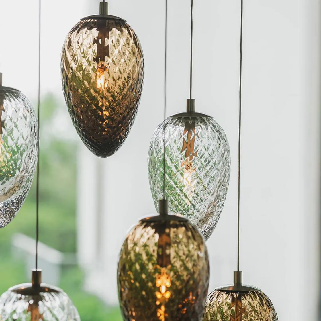Inneholder 5 munnblåste kongler i flott harmoni, i størrelsene 17cm, 21cm og 23cm i kakao og 17cm og 23cm klart glass.