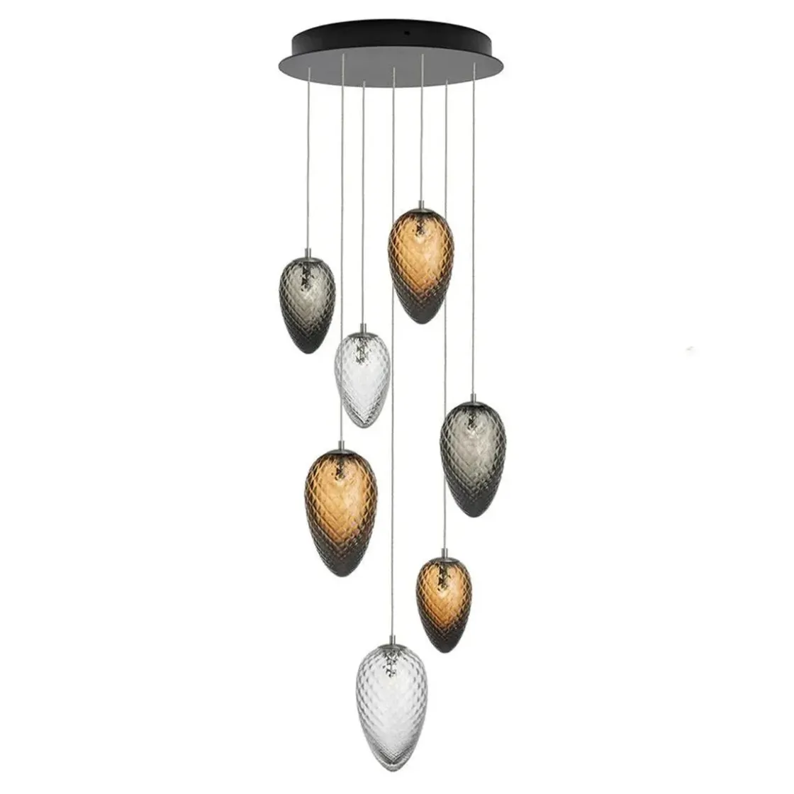 Inneholder 7 munnblåste kongler, i størrelsene 17cm, 21cm og 23cm i kakao, 17cm og 23cm klart glass og 17cm og 23cm røkgrå.