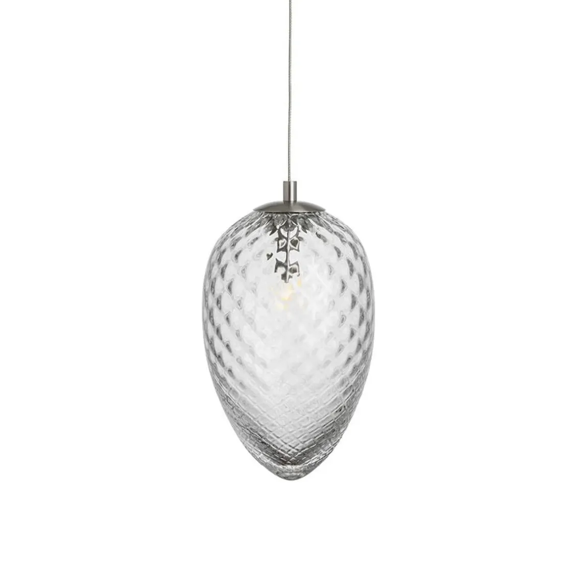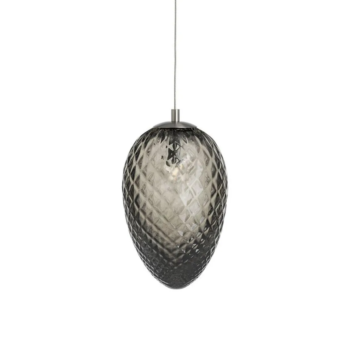 Inneholder 5 munnblåste kongler i flott harmoni, i størrelsene 17cm, 21cm og 23cm i røkgrå og 17cm og 23cm klart glass.