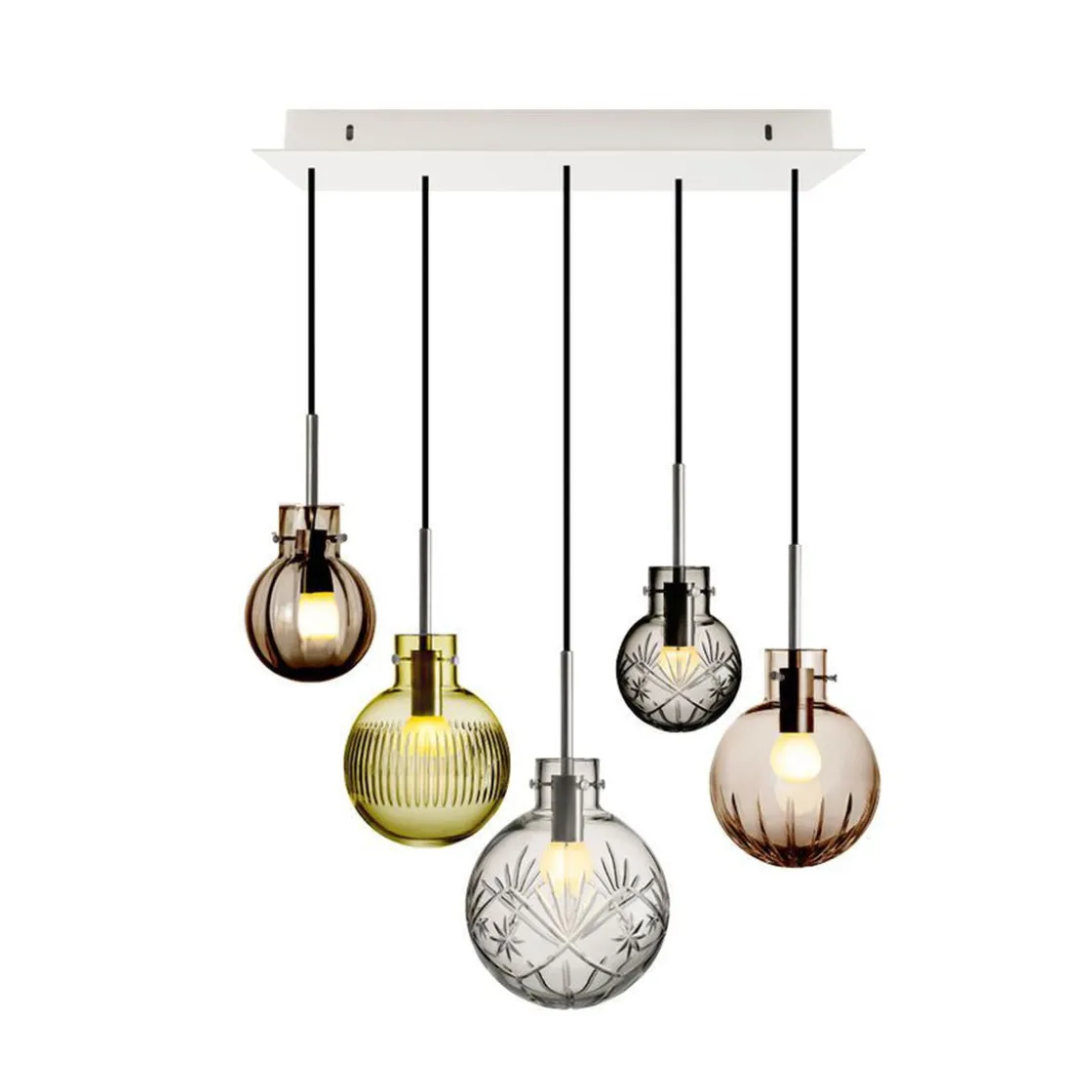 I denne kombinasjonen medfølger følgende krystallkuler: Krystallkulene Finn Klar 200 mm, Finn Røkgrå 120mm, Optikk Kakao 120 mm, Skjær Oliven 160 mm og Stor Stjerne Kakao 160mm. Ståloppheng til 5 Krystallkuler med sort tekstiltrukket kabel på 3 meter. Hvit rektangulær takbaldakin 50cm